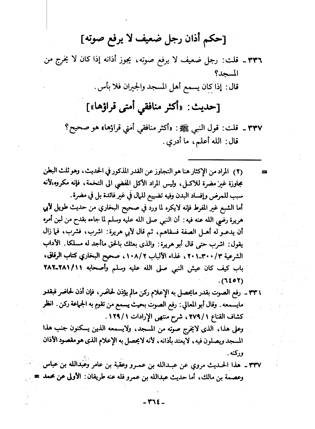 ٣٣٦ - قلت رجل ضَعِيف لَا يرفع صَوته يجوز أَذَانه إِذا كَانَ لَا يخرج من الْمَسْجِد قَالَ إِذا كَانَ يسمع أهل الْمَسْجِد وَالْجِيرَان فَلَا بَأْس