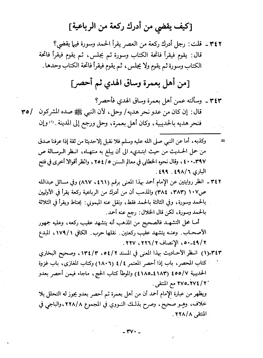 ٣٤٢ - قلت رجل أدْرك رَكْعَة من الْعَصْر يقْرَأ الْحَمد وَسورَة فِيمَا يقْضِي قَالَ يقوم فَيقْرَأ فَاتِحَة الْكتاب وَسورَة ثمَّ يجلس ثمَّ يقوم فَيقْرَأ فَاتِحَة الْكتاب وَسورَة ثمَّ يقوم وَلَا يجلس ثمَّ يقوم فَيقْرَأ فَاتِحَة الْكتاب وَحدهَا