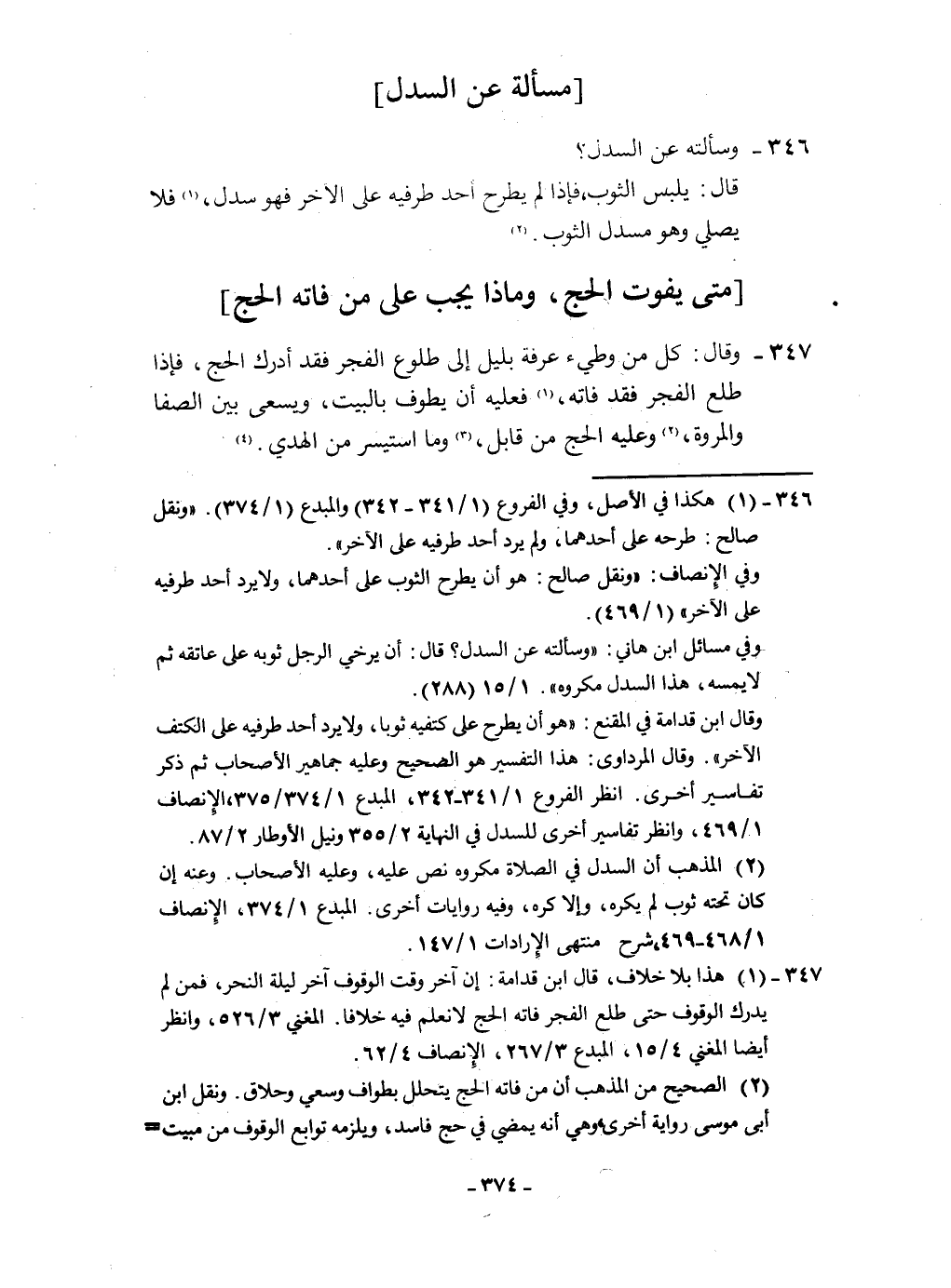 ٣٤٦ - وَسَأَلته عَن السدل قَالَ يلبس الثَّوْب فَإِذا لم يطْرَح أحد طَرفَيْهِ على الآخر فَهُوَ سدل فَلَا يُصَلِّي وَهُوَ مسدل الثَّوْب