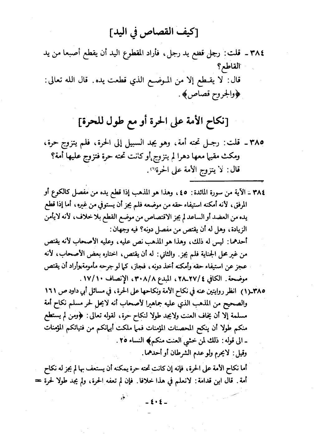 ٣٨٤ - قلت رجل قطع يَد رجل فَأَرَادَ الْمَقْطُوع الْيَد أَن يقطع أصبعا من يَد الْقَاطِع قَالَ لَا يقطع إِلَّا من الْموضع الَّذِي قطعت يَده قَالَ الله تَعَالَى {والجروح قصاص}