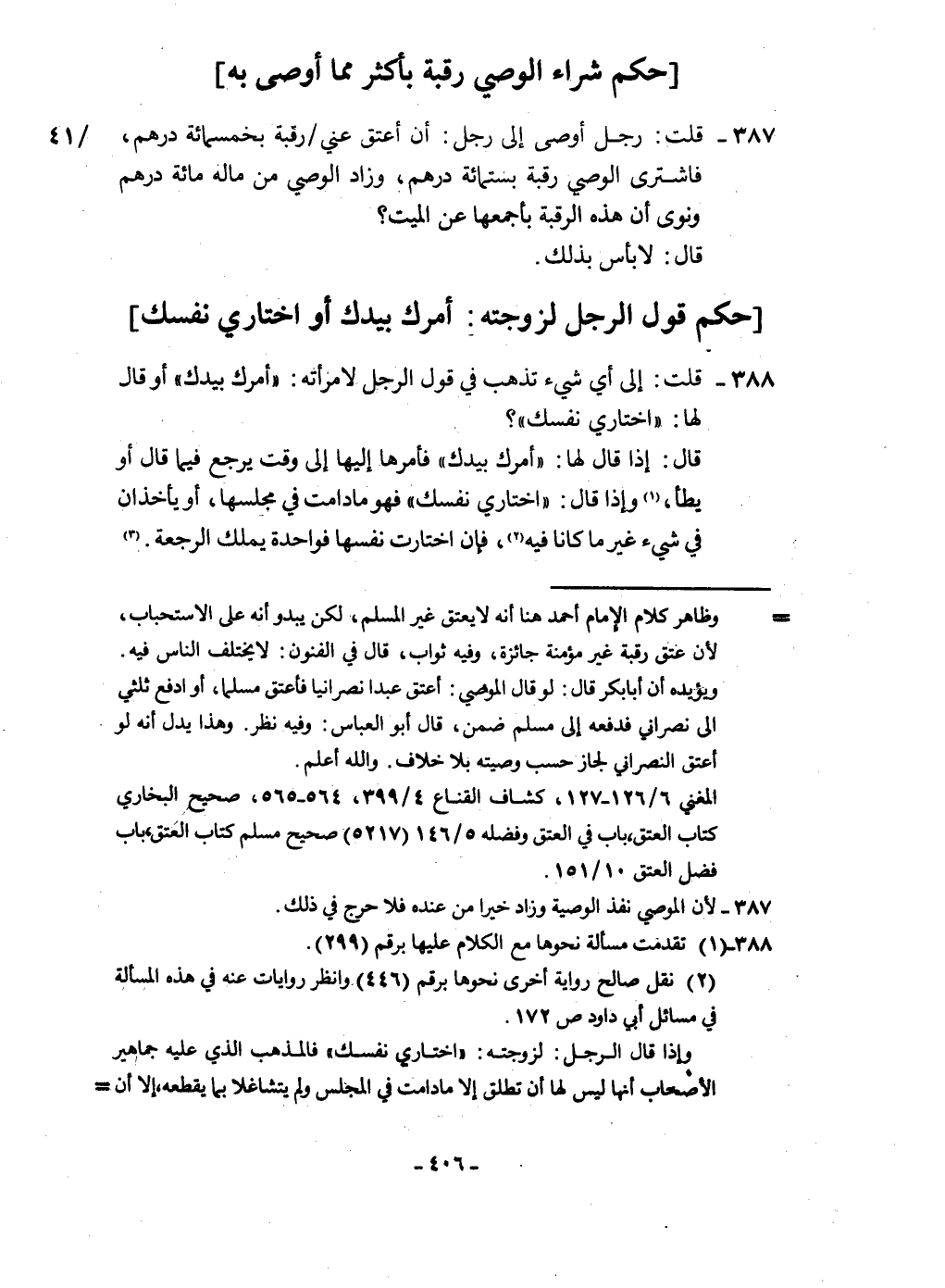 ٣٨٨ - قلت إِلَى أَي شَيْء تذْهب فِي قَول الرجل لامْرَأَته أَمرك بِيَدِك أَو قَالَ لَهَا اخْتَارِي نَفسك قَالَ إِذا قَالَ لَهَا أَمرك بِيَدِك فَأمرهَا إِلَيْهَا إِلَى وَقت يرجع فِيمَا قَالَ أَو يطَأ وَإِذا قَالَ اخْتَارِي نَفسك فَهُوَ مَا دَامَت فِي مجلسها أَو يأخذان فِي شَيْء غير ماكانا فِيهِ فَإِن اخْتَارَتْ نَفسهَا فَوَاحِدَة يملك الرّجْعَة