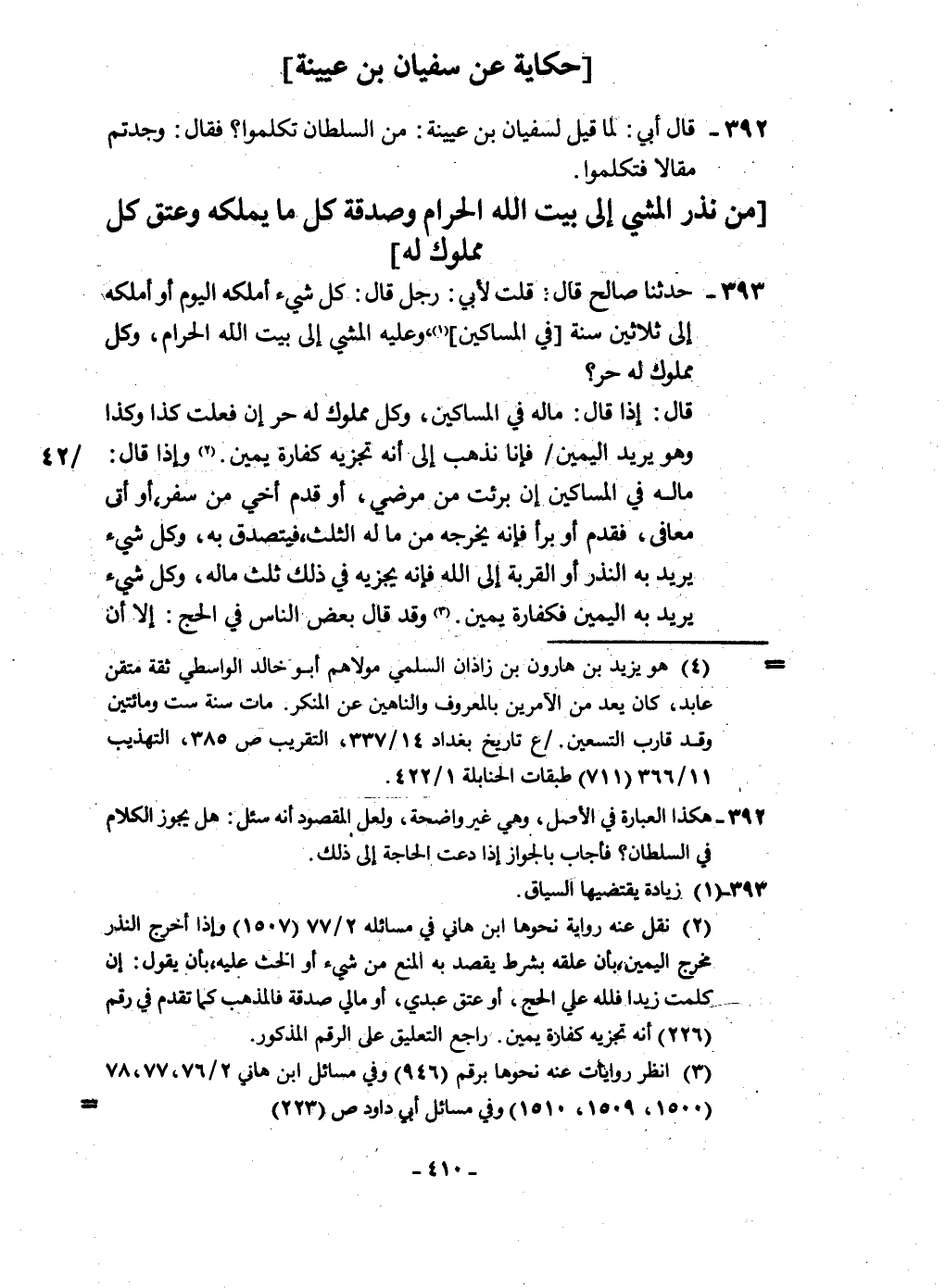 ٣٩٢ - قَالَ أبي لما قيل لِسُفْيَان بن عُيَيْنَة من السُّلْطَان تكلمُوا فَقَالَ وجدْتُم مقَالا فتكلموا