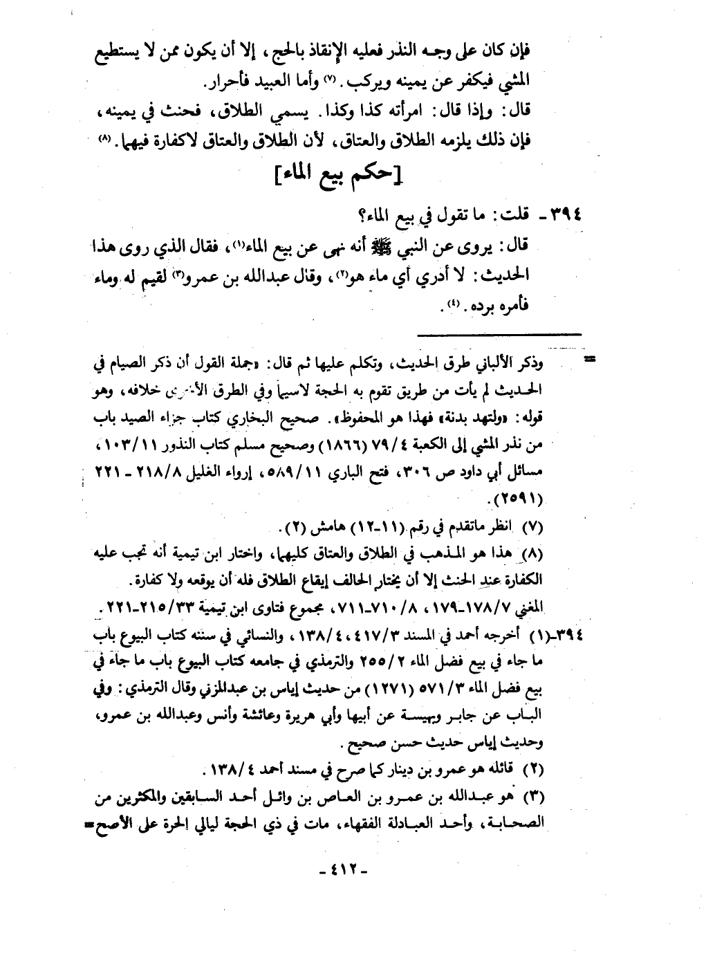 ٣٩٤ - قلت مَا تَقول فِي بيع المَاء قَالَ يرْوى عَن النَّبِي صلى الله عَلَيْهِ وَسلم أَنه نهى عَن بيع المَاء فَقَالَ الَّذِي روى هَذَا الحَدِيث لَا أَدْرِي أَي مَاء هُوَ وَقَالَ عبد الله بن عَمْرو لقيم لَهُ وَمَاء فَأمره برده