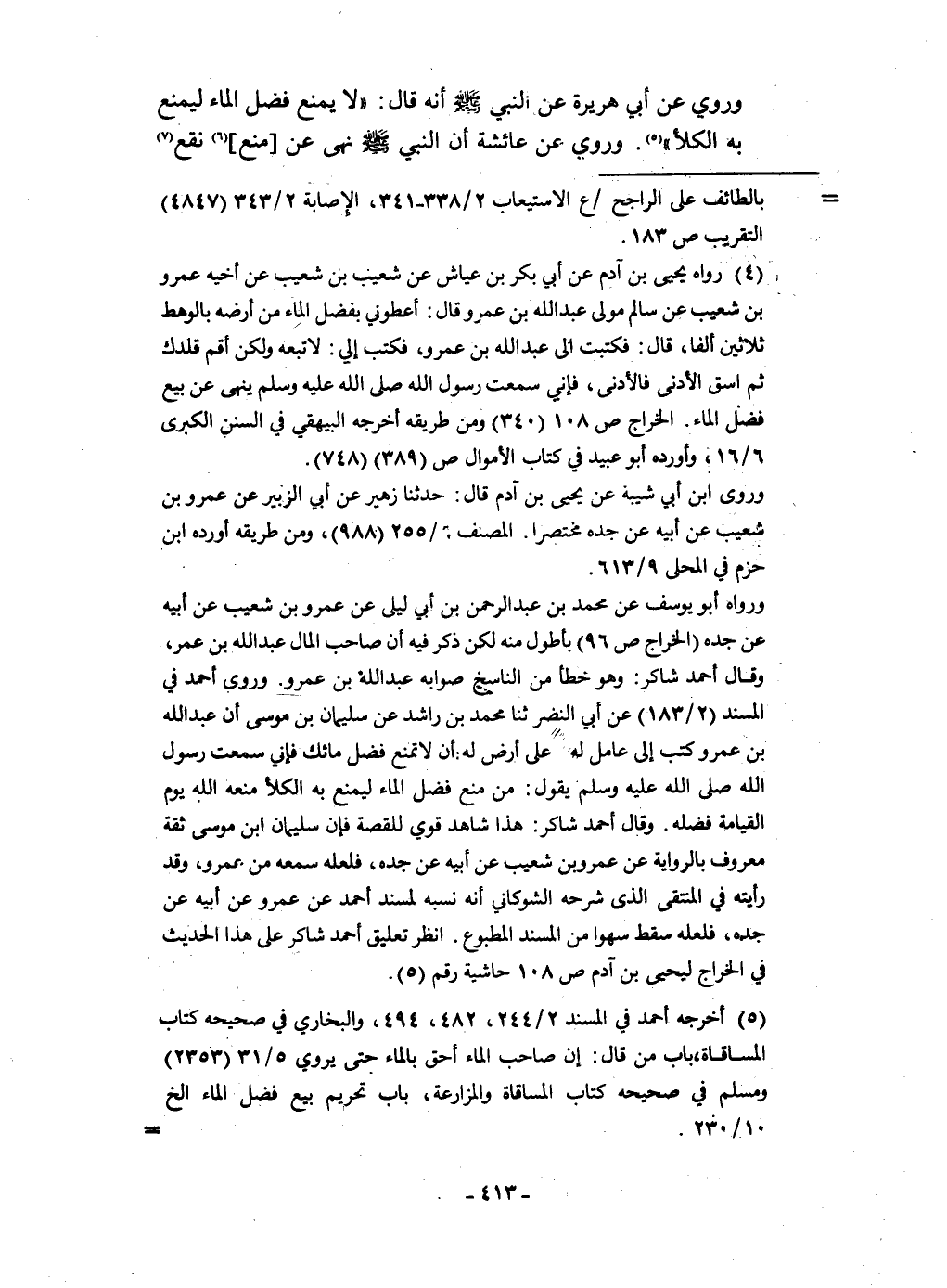 وَرُوِيَ عَن أبي هُرَيْرَة عَن النَّبِي صلى الله عَلَيْهِ وَسلم أَنه قَالَ لَا يمْنَع فضل المَاء ليمنع بِهِ الْكلأ وَرُوِيَ عَن عَائِشَة أَن النَّبِي صلى الله عَلَيْهِ وَسلم نهى عَن منع نقع