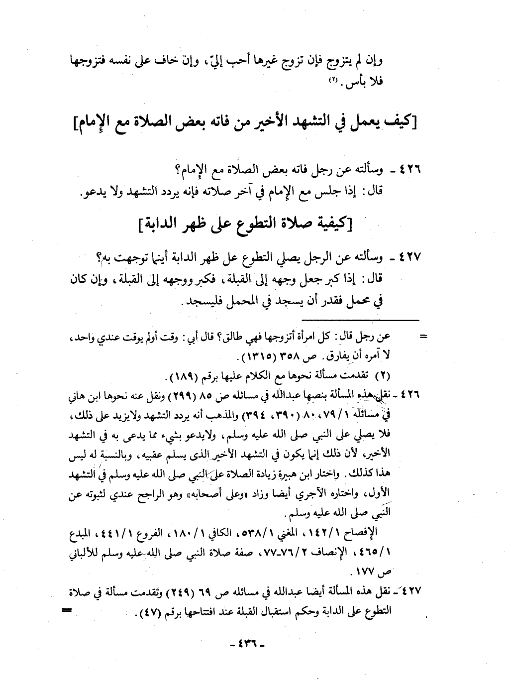 ٤٢٥ - وَسَأَلته عَن الطَّلَاق قبل النِّكَاح قَالَ وَقت أَو لم يُوَقت فَهُوَ وَاحِد مذْهبه إِذا تزوج أَن لَا يفارقها