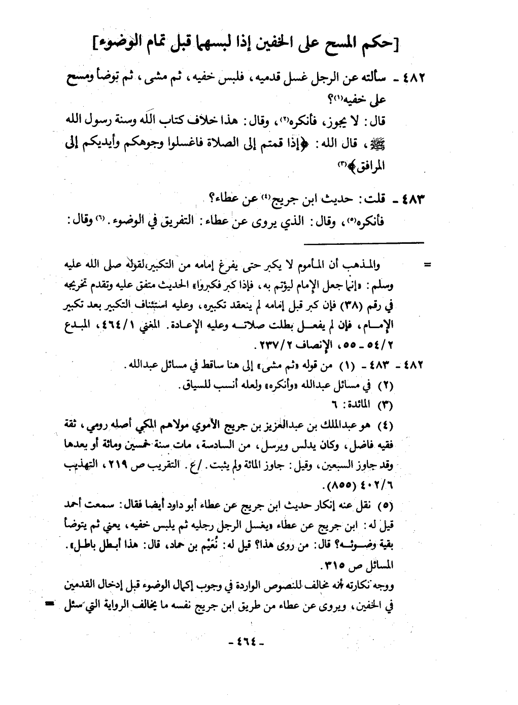 ٤٨٢ - سَأَلته عَن الرجل غسل قَدَمَيْهِ فَلبس خفيه ثمَّ مَشى ثمَّ تَوَضَّأ وَمسح على خفيه قَالَ لَا يجوز فَأنكرهُ وَقَالَ هَذَا خلاف كتاب الله وَسنة رَسُول الله صلى الله عَلَيْهِ وَسلم قَالَ الله {إِذا قُمْتُم إِلَى الصَّلَاة فَاغْسِلُوا وُجُوهكُم وَأَيْدِيكُمْ إِلَى الْمرَافِق}