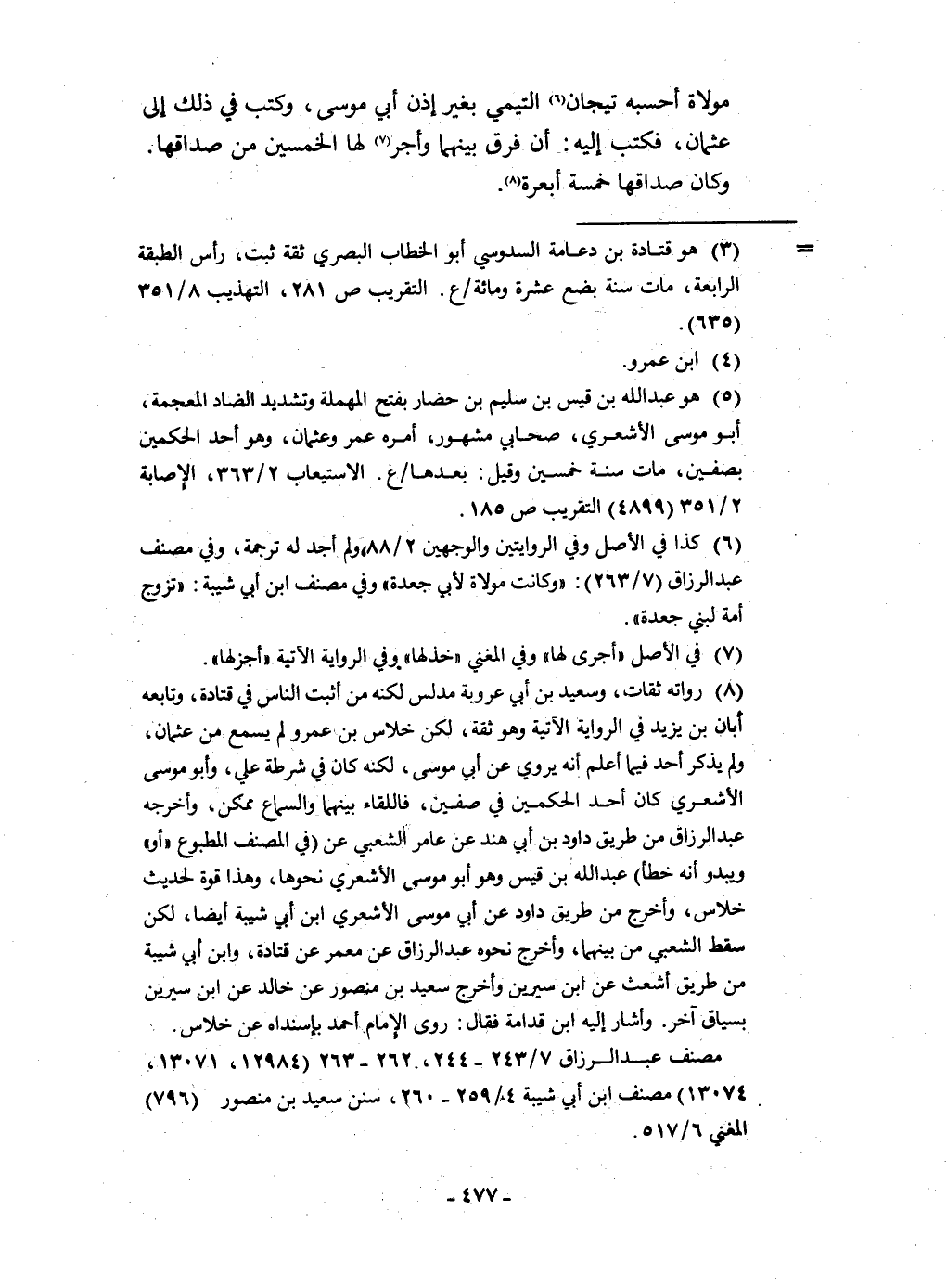 مولاة أَحْسبهُ تيجان التَّيْمِيّ بِغَيْر إِذن أبي مُوسَى وَكتب فِي ذَلِك إِلَى عُثْمَان فَكتب إِلَيْهِ أَن فرق بَينهمَا وَأجر لَهَا الْخمسين من صَدَاقهَا وَكَانَ صَدَاقهَا خَمْسَة أَبْعِرَة