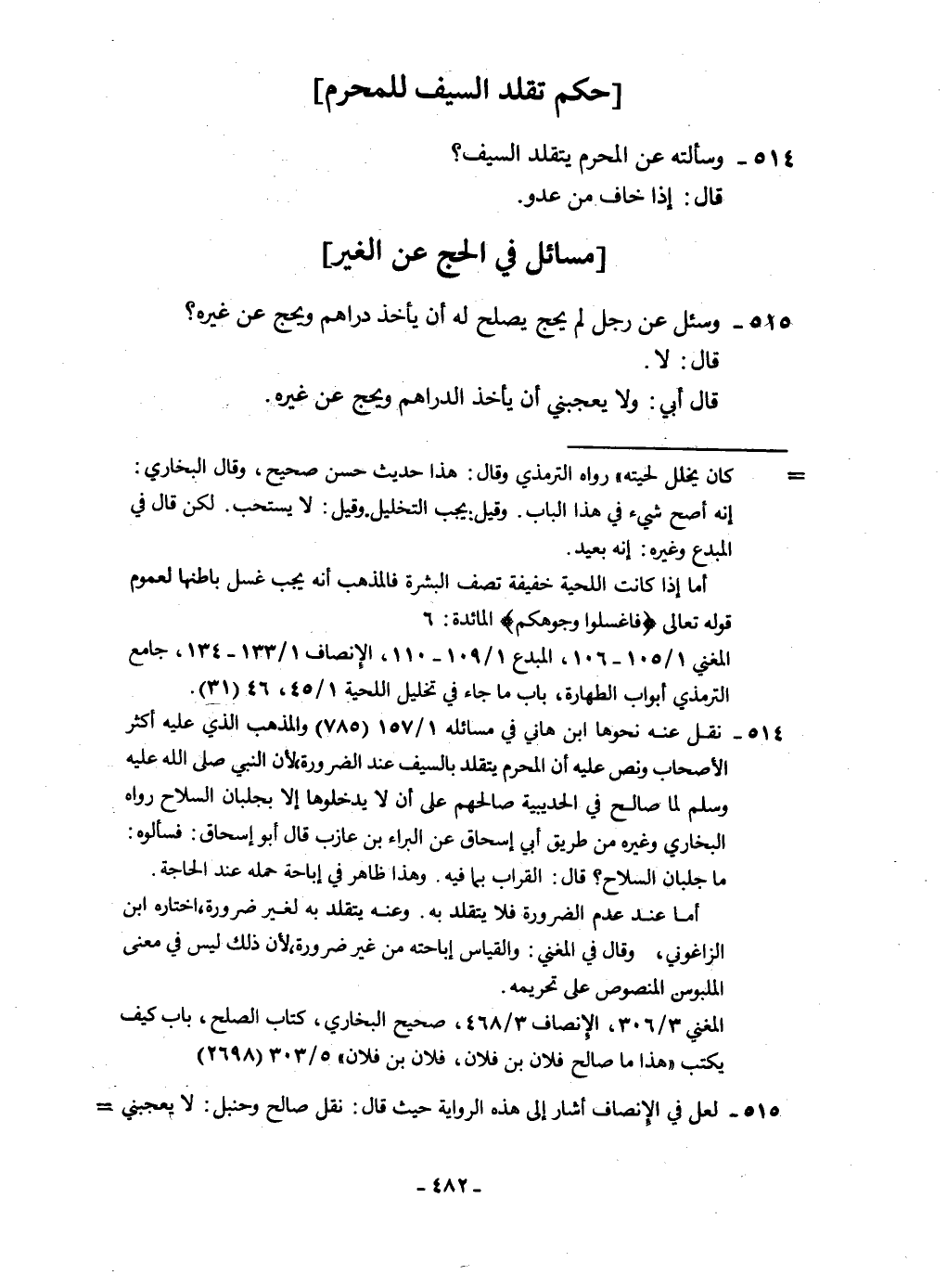 ٥١٤ - وَسَأَلته عَن الْمحرم يتقلد السَّيْف قَالَ إِذا خَافَ من عَدو