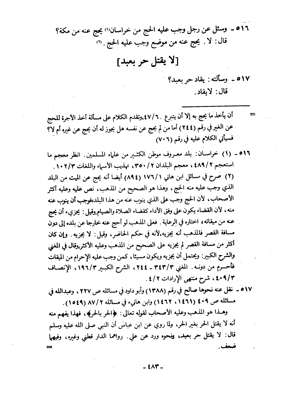 ٥١٧ - وَسَأَلته يُقَاد حر بِعَبْد قَالَ لَا يُقَاد