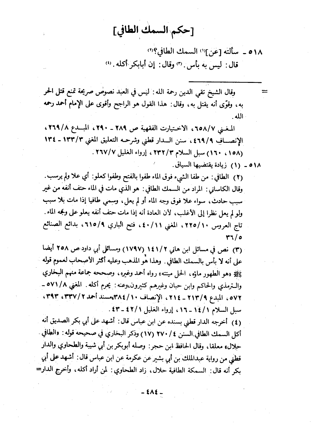 ٥١٨ - سَأَلته عَن السّمك الطافي قَالَ لَيْسَ بِهِ بَأْس وَقَالَ إِن أَبَا بكر أكله