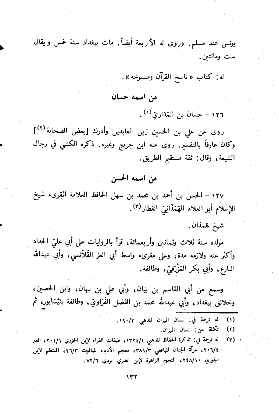 127 - الحسن بن أحمد بن محمد بن سهل الحافظ العلامة المقرئ شيخ الإسلام أبو العلاء الهمذانيّ العطار (¬3).
