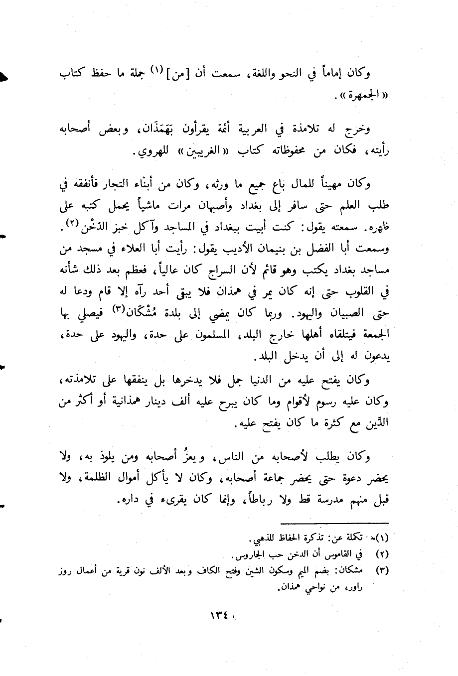 وكان مهينا للمال باع جميع ما ورثه، وكان من أبناء التجار فأنفقه في طلب العلم حتى سافر إلى بغداد وأصبهان مرات ماشيا يحمل كتبه على ظهره. سمعته يقول: كنت أبيت ببغداد في المساجد وآكل خبز الدّخن (¬2).