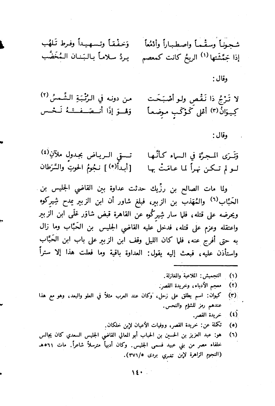 (¬6) هو: عبد العزيز بن الحسين بن الحباب أبو المعالي القاضي الجليس السعدي كان يجالس خلفاء مصر من بني عبيد فسمى الجليس. وكان أدبيا مترسلا شاعرا. مات 561 هـ (النجوم الزاهرة لابن تغري بردى 5/ 371).