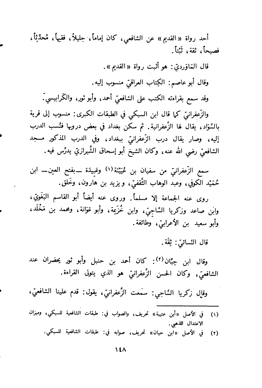 وقال زكريا السّاجي: سمعت الزّعفرانيّ، يقول: قدم علينا الشافعيّ،