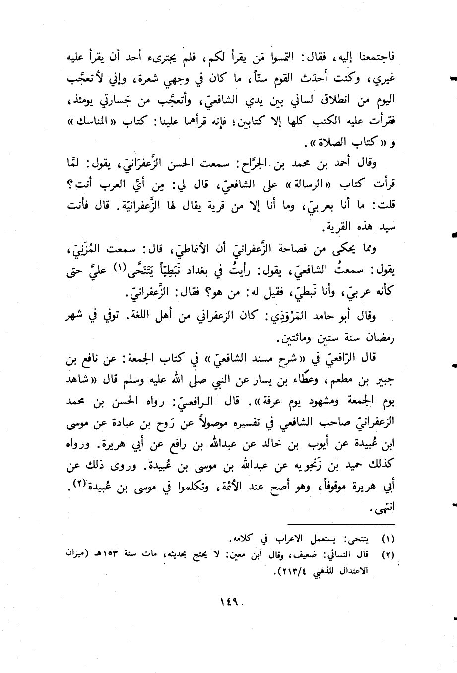 وقال أحمد بن محمد بن الجرّاح: سمعت الحسن الزّعفرانيّ، يقول: لمّا قرأت كتاب «الرسالة» على الشافعيّ، قال لي: من أيّ العرب أنت؟