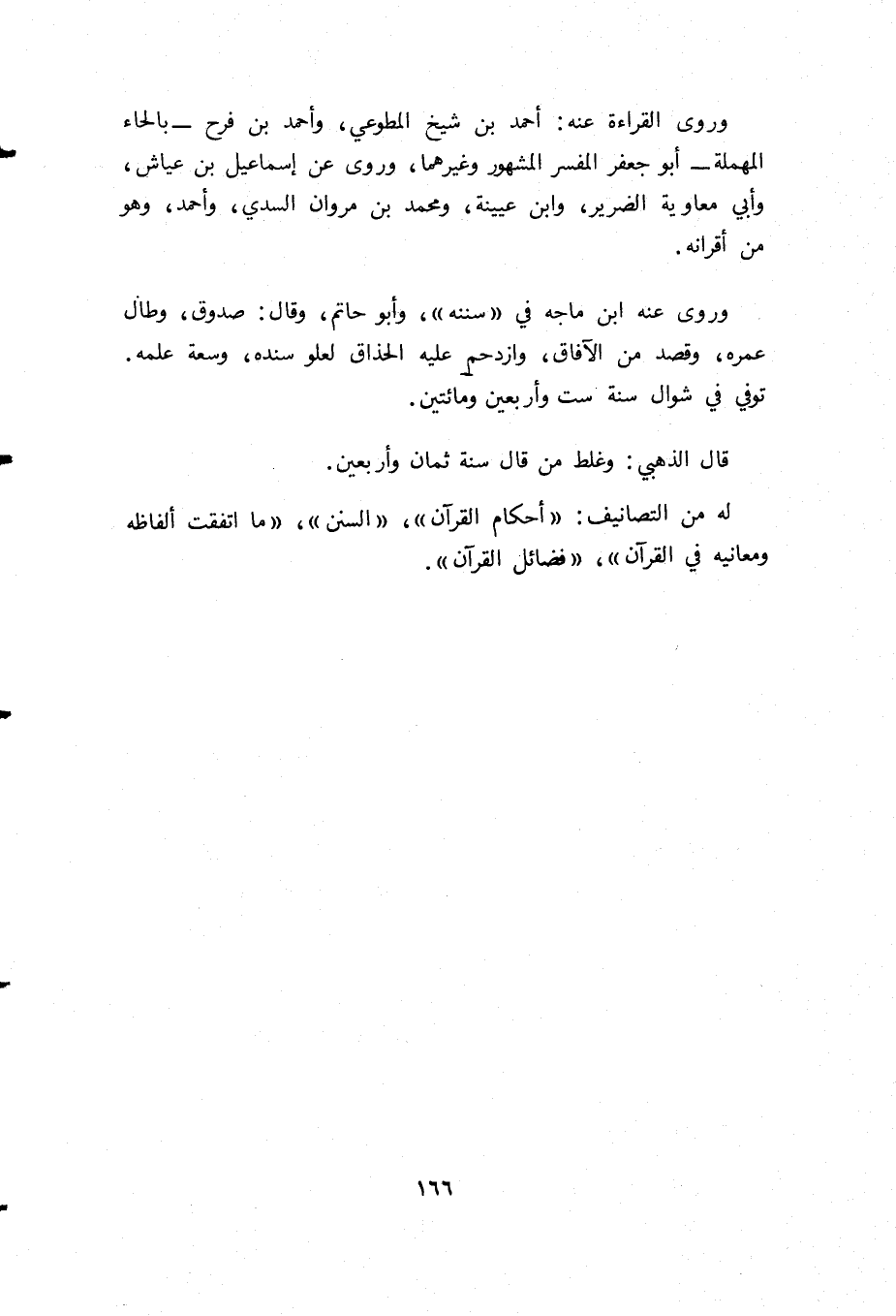 له من التصانيف: «أحكام القرآن»، «السنن»، «ما اتفقت ألفاظه ومعانيه في القرآن»، «فضائل القرآن».