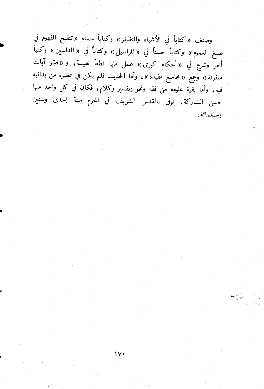 وصنف «كتابا في الأشباه والنظائر» وكتابا سماه «تنقيح الفهوم في صيغ العموم» وكتابا حسنا في «المراسيل» وكتابا في «المدلسين» وكتبا أخر وشرع في «أحكام كبرى» عمل منها قطعا نفيسة، و «فسّر آيات متفرقة» وجمع «مجاميع مفيدة»، وأما الحديث فلم يكن في عصره من يدانيه فيه، وأما بقية علومه من فقه ونحو وتفسير وكلام، فكان في كل واحد منها حسن المشاركة. توفي بالقدس الشريف في المحرم سنة إحدى وستين وسبعمائة.