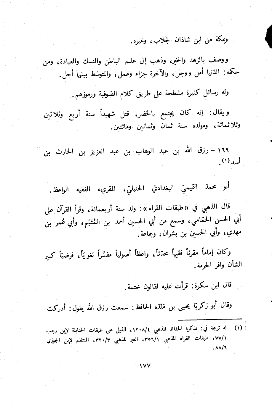 (¬1) له ترجمة في: تذكرة الحفاظ للذهبي 4/ 1208، الذيل على طبقات الحنابلة لابن رجب 1/ 77، طبقات القراء للذهبي 1/ 356، العبر للذهبي 3/ 320، المنتظم لابن الجوزي 9/ 88.