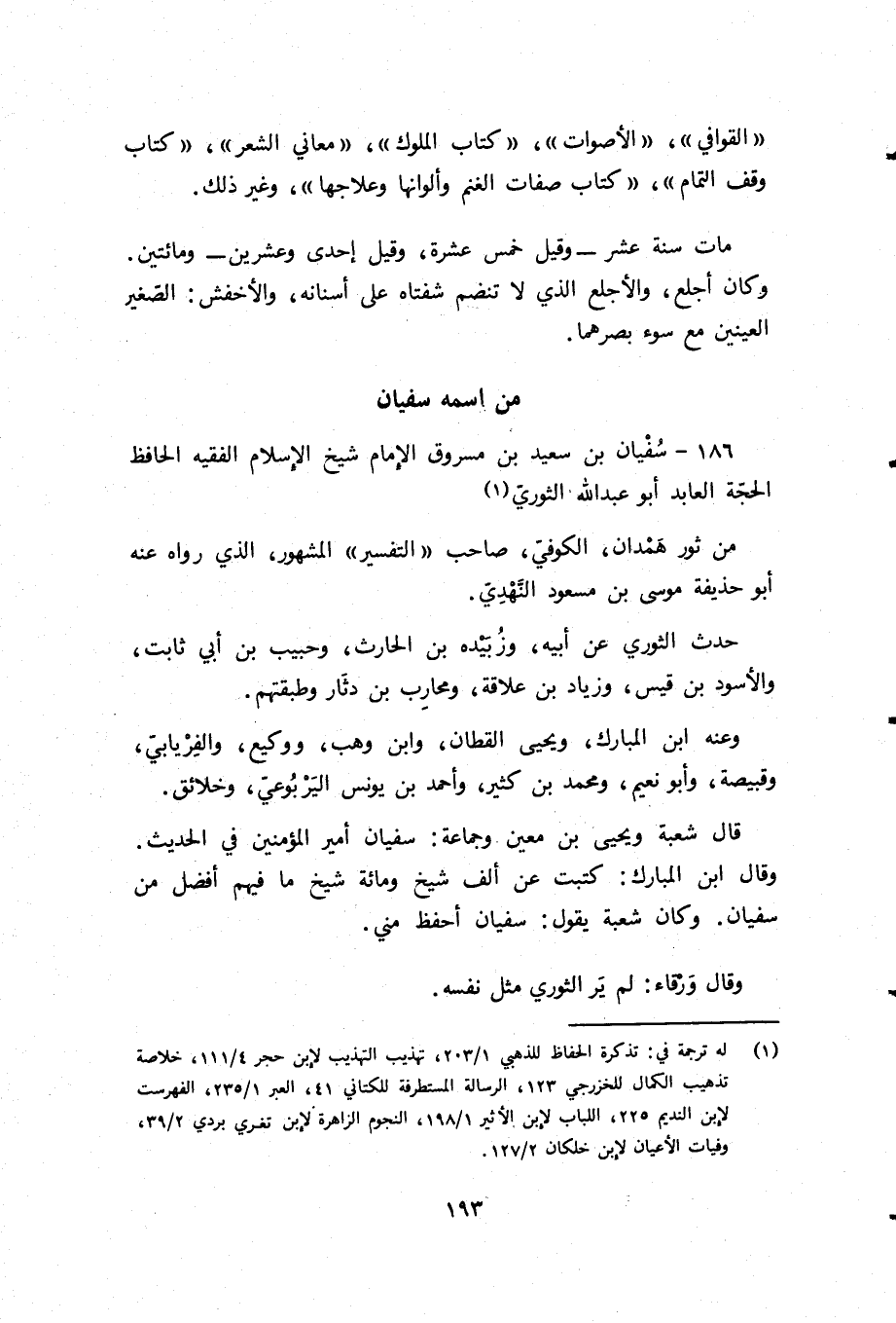 186 - سفيان بن سعيد بن مسروق الإمام شيخ الإسلام الفقيه الحافظ الحجّة العابد أبو عبد الله الثوريّ (¬1) من ثور همدان، الكوفيّ، صاحب «التفسير» المشهور، الذي رواه عنه أبو حذيفة موسى بن مسعود النّهديّ.