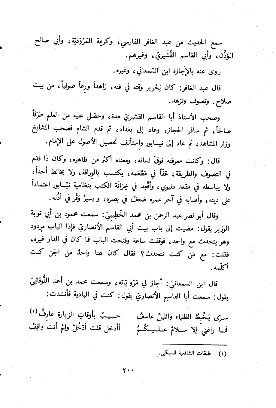 قال ابن السمعانيّ: أجاز لي مرويّاته، وسمعت محمد بن أحمد النّوقانيّ يقول: سمعت أبا القاسم الأنصاريّ يقول: كنت في البادية فأنشدت: