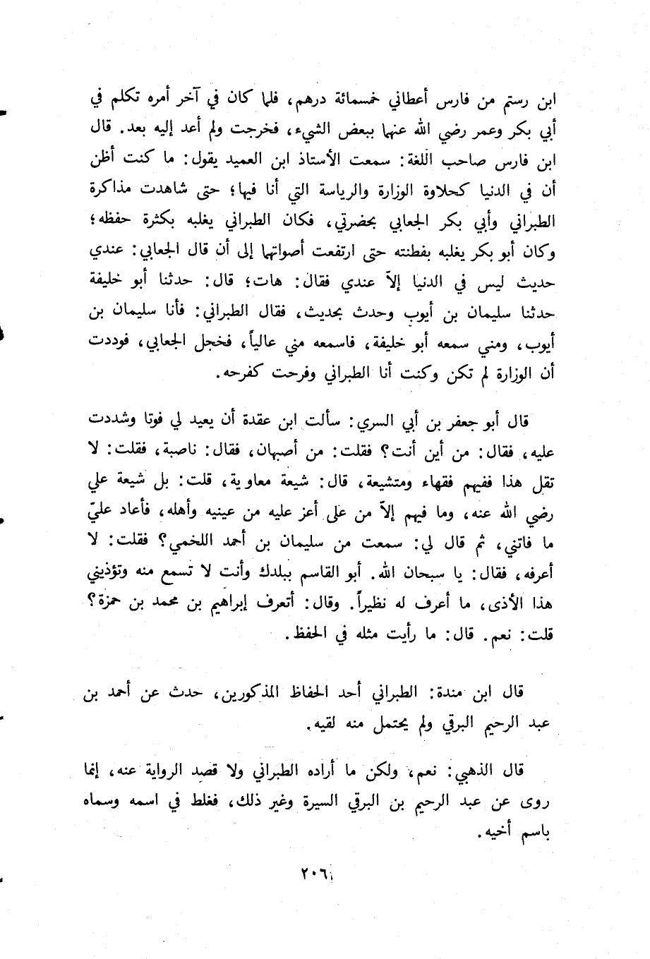 قال ابن مندة: الطبراني أحد الحفاظ المذكورين، حدث عن أحمد بن عبد الرحيم البرقي ولم يحتمل منه لقيه.