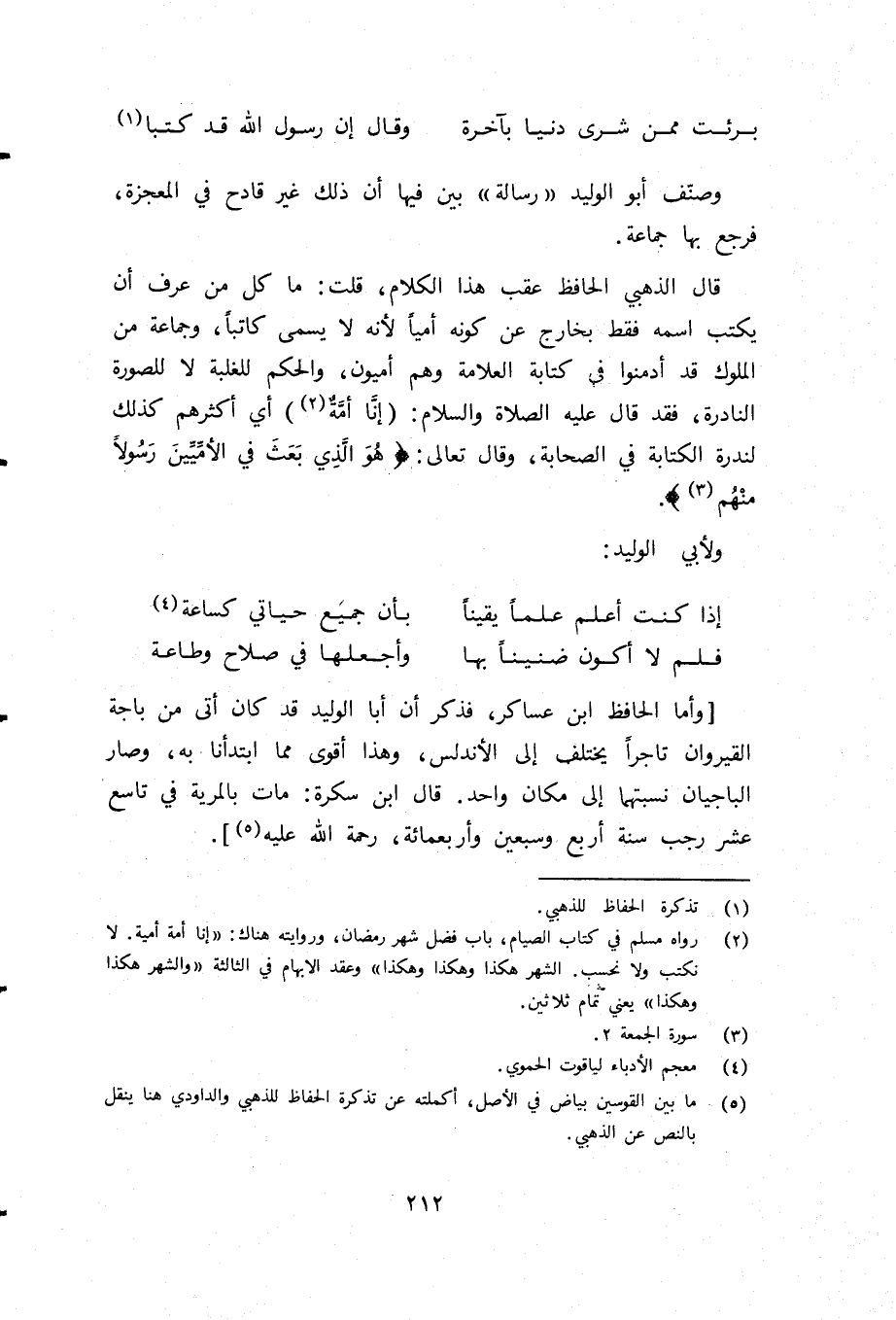 قال الذهبي الحافظ عقب هذا الكلام، قلت: ما كل من عرف أن يكتب اسمه فقط بخارج عن كونه أميا لأنه لا يسمى كاتبا، وجماعة من الملوك قد أدمنوا في كتابة العلامة وهم أميون، والحكم للغلبة لا للصورة النادرة، فقد قال عليه الصلاة والسلام: (إنّا أمّة (¬2)) أي أكثرهم كذلك لندرة الكتابة في الصحابة، وقال تعالى: هُوَ الَّذِي بَعَثَ فِي الْأُمِّيِّينَ رَسُولًا مِنْهُمْ (¬3).