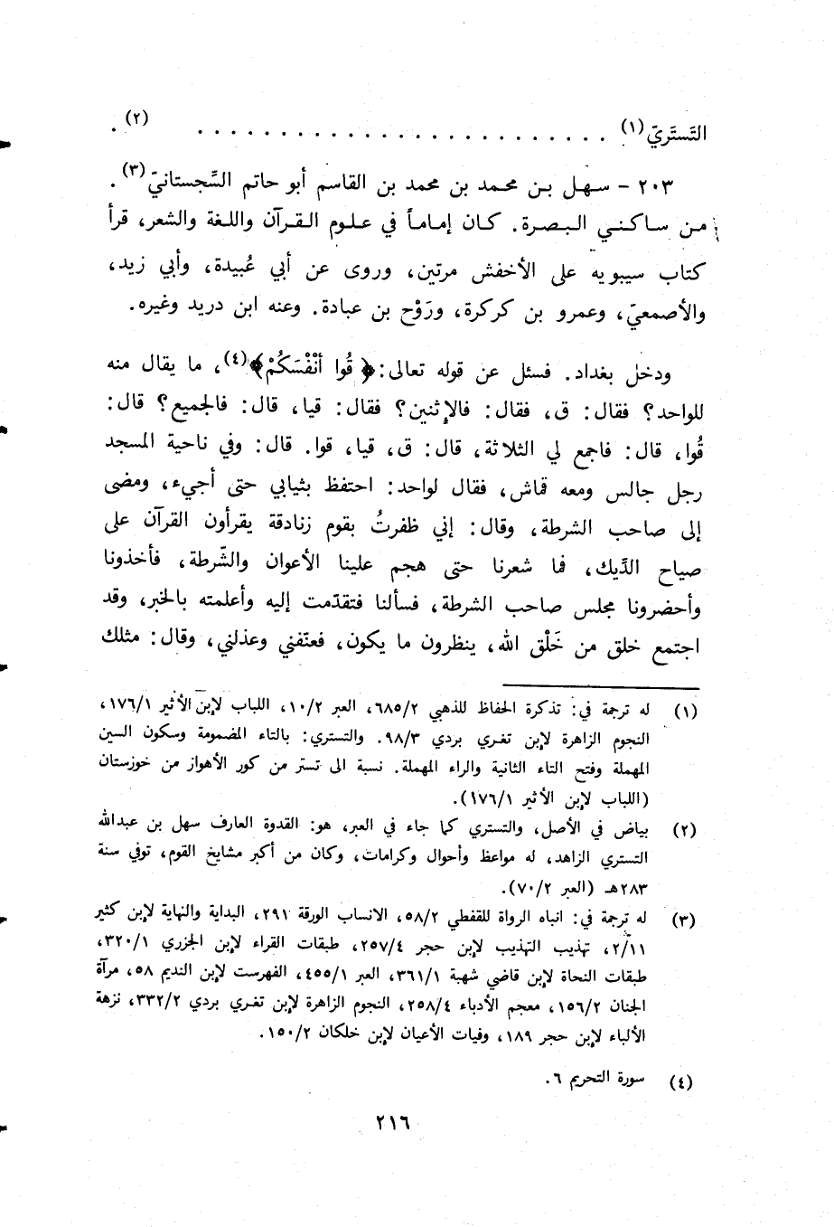 (¬1) له ترجمة في: تذكرة الحفاظ للذهبي 2/ 685، العبر 2/ 10، اللباب لابن الأثير 1/ 176، النجوم الزاهرة لابن تغري بردي 3/ 98. والتستري: بالتاء المضمومة وسكون السين المهملة وفتح التاء الثانية والراء المهملة. نسبة الى تستر من كور الأهواز من خوزستان (اللباب لابن الأثير 1/ 176).