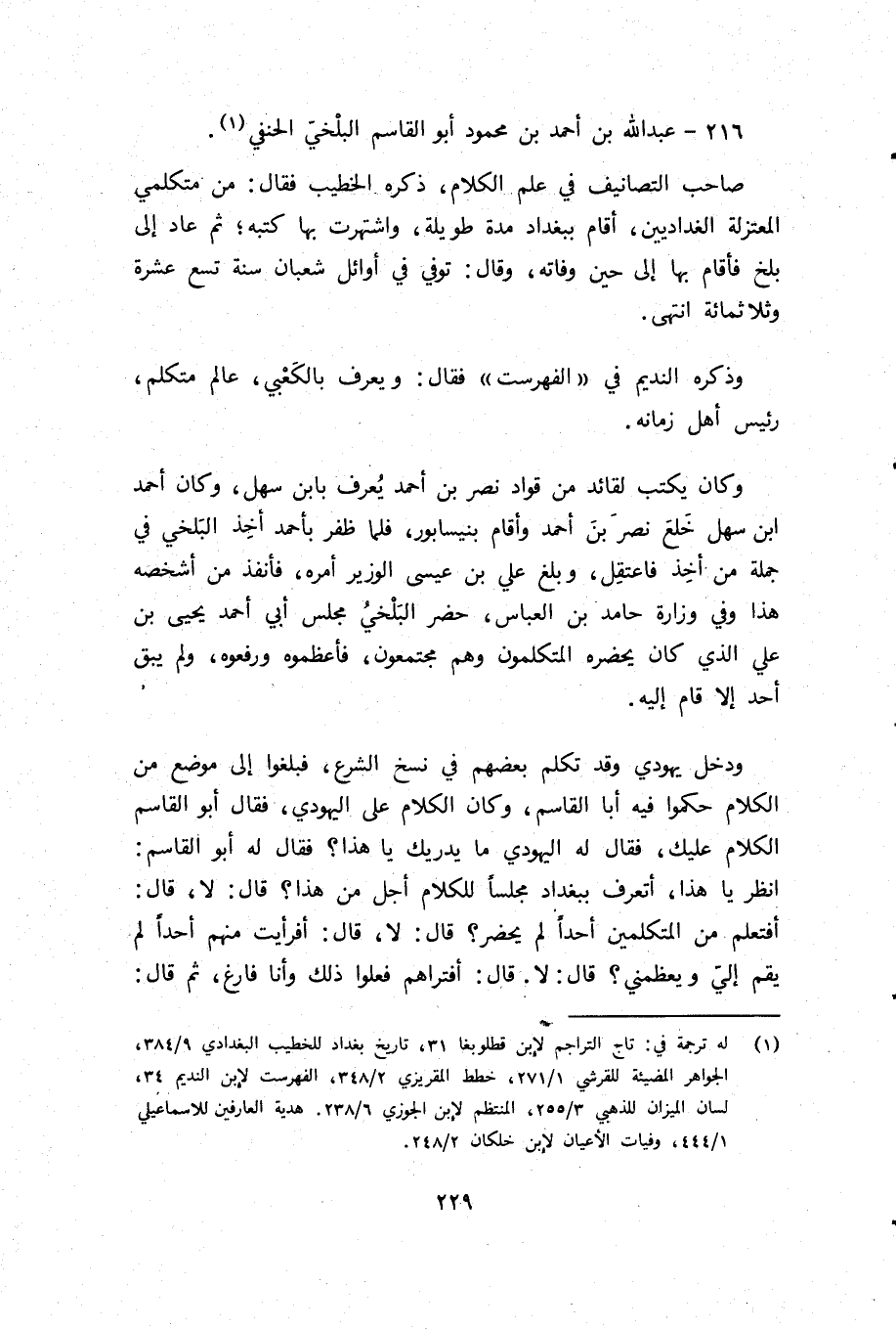 صاحب التصانيف في علم الكلام، ذكره الخطيب فقال: من متكلمي المعتزلة البغداديين، أقام ببغداد مدة طويلة، واشتهرت بها كتبه؛ ثم عاد إلى بلخ فأقام بها إلى حين وفاته، وقال: توفي في أوائل شعبان سنة تسع عشرة وثلاثمائة انتهى.