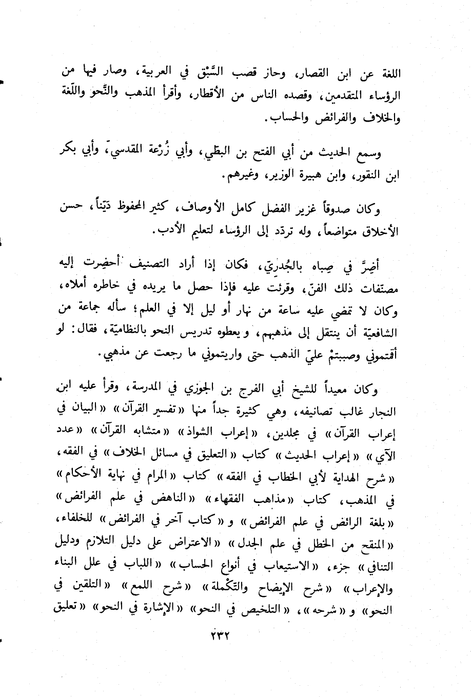 وكان معيدا للشيخ أبي الفرج بن الجوزي في المدرسة، وقرأ عليه ابن النجار غالب تصانيفه، وهي كثيرة جدا منها «تفسير القرآن» «البيان في إعراب القرآن» في مجلدين، «إعراب الشواذ» «متشابه القرآن» «عدد الآي» «إعراب الحديث» كتاب «التعليق في مسائل الخلاف» في الفقه، «شرح الهداية لأبي الخطاب في الفقه» كتاب «المرام في نهاية الأحكام» في المذهب، كتاب «مذاهب الفقهاء» «الناهض في علم الفرائض» «بلغة الرائض في علم الفرائض» و «كتاب آخر في الفرائض» للخلفاء، «المنقع من الخطل في علم الجدل» «الاعتراض على دليل التلازم ودليل التنافي» جزء، «الاستيعاب في أنواع الحساب» «اللباب في علل البناء والإعراب» «شرح الإيضاح والتّكملة» «شرح اللمع» «التلقين في النحو» و «شرحه»، «التلخيص في النحو» «الإشارة في النحو» «تعليق