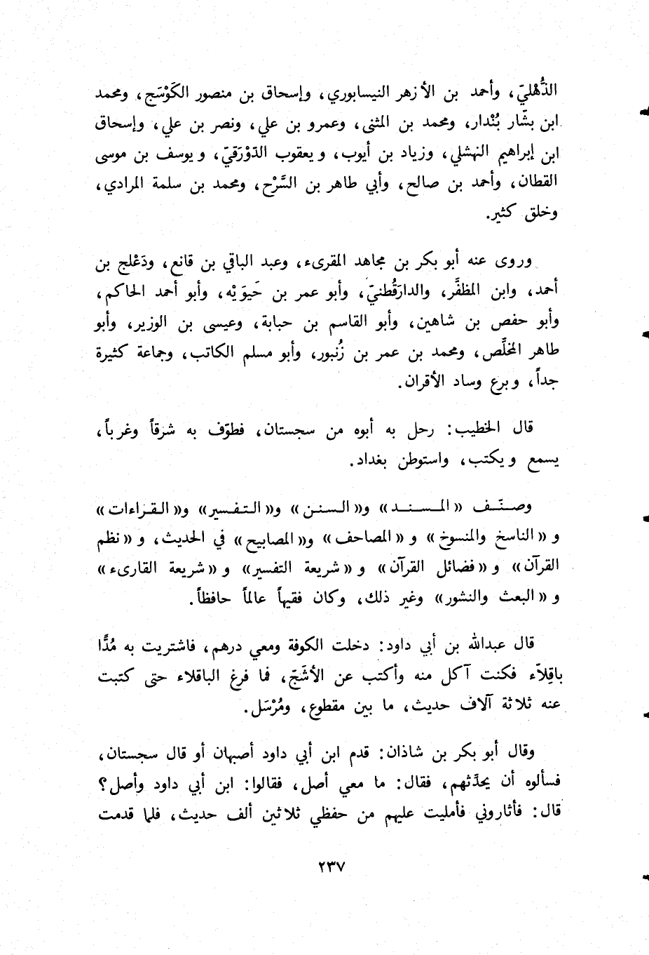 قال الخطيب: رحل به أبوه من سجستان، فطوّف به شرقا وغربا، يسمع ويكتب، واستوطن بغداد.