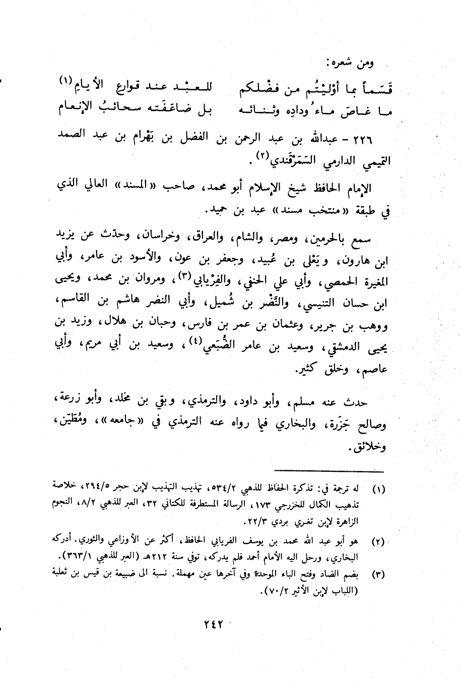226 - عبد الله بن عبد الرحمن بن الفضل بن بهرام بن عبد الصمد التميمي الدارمي السمرقندي (¬2).