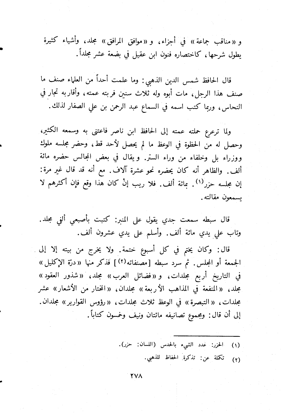 قال: وكان يختم في كل أسبوع ختمة. ولا يخرج من بيته إلا إلى الجمعة أو المجلس. ثم سرد سبطه [مصنفاته (¬2)] فذكر منها «درّة الإكليل» في التاريخ أربع مجلدات، و «فضائل العرب» مجلد، «شذور العقود» مجلد، «المنفعة في المذاهب الأربعة» مجلدان، «المختار من الأشعار» عشر مجلدات، «التبصرة» في الوعظ ثلاث مجلدات، «رءوس القوارير» مجلدان.