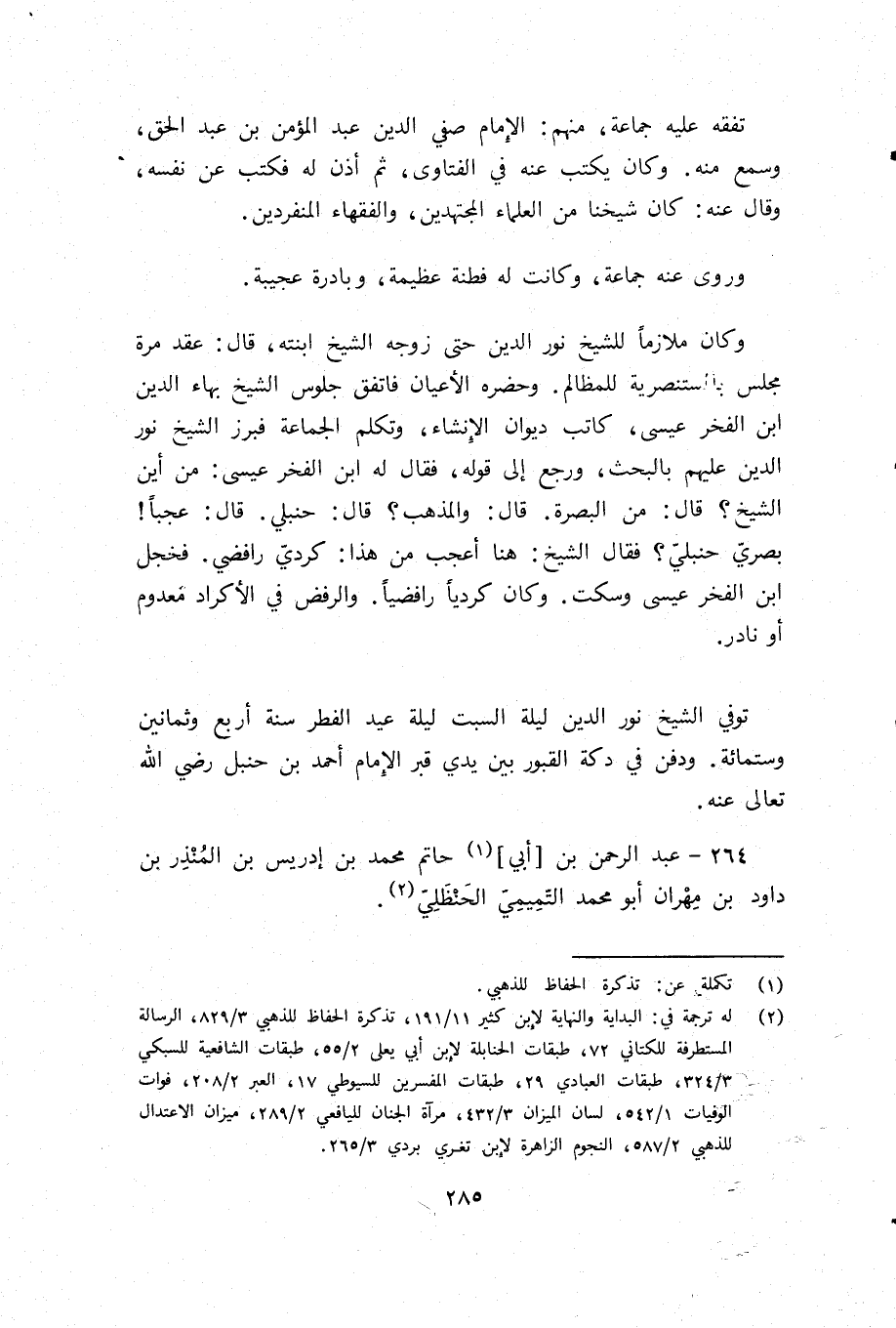 وكان ملازما للشيخ نور الدين حتى زوجه الشيخ ابنته، قال: عقد مرة مجلس بالمستنصرية للمظالم. وحضره الأعيان فاتفق جلوس الشيخ بهاء الدين ابن الفخر عيسى، كاتب ديوان الإنشاء، وتكلم الجماعة فبرز الشيخ نور الدين عليهم بالبحث، ورجع إلى قوله، فقال له ابن الفخر عيسى: من أين الشيخ؟ قال: من البصرة. قال: والمذهب؟ قال: حنبلي. قال: عجبا! بصريّ حنبليّ؟ فقال الشيخ: هنا أعجب من هذا: كرديّ رافضي. فخجل ابن الفخر عيسى وسكت. وكان كرديا رافضيا. والرفض في الأكراد معدوم أو نادر.