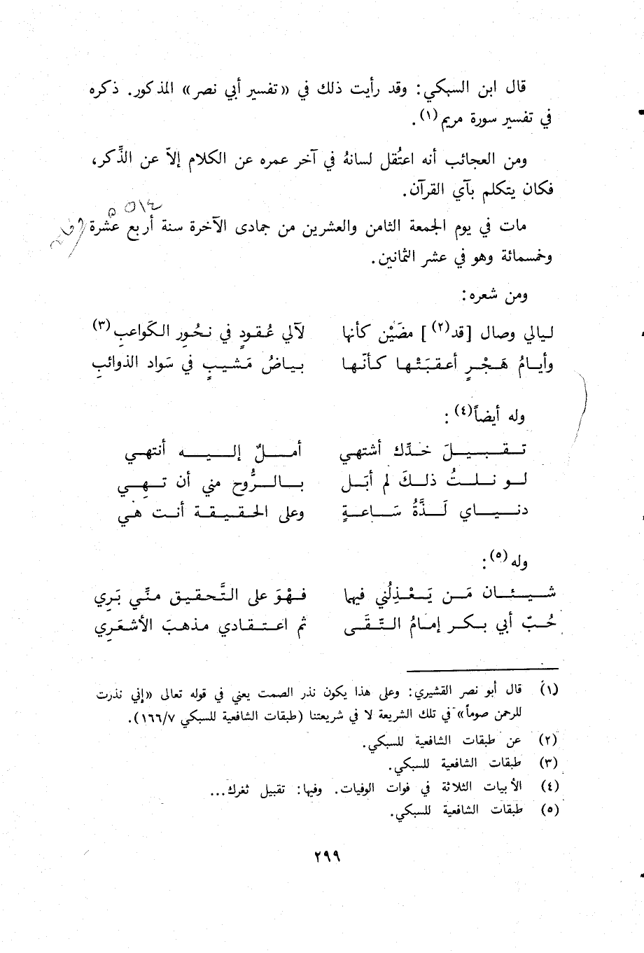 قال ابن السبكي: وقد رأيت ذلك في «تفسير أبي نصر» المذكور. ذكره في تفسير سورة مريم (¬1).