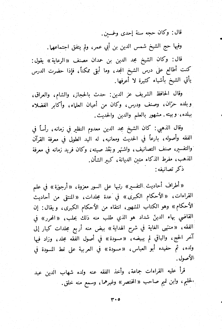 قال: وكان الشيخ مجد الدين بن حمدان مصنف «الرعاية» يقول: