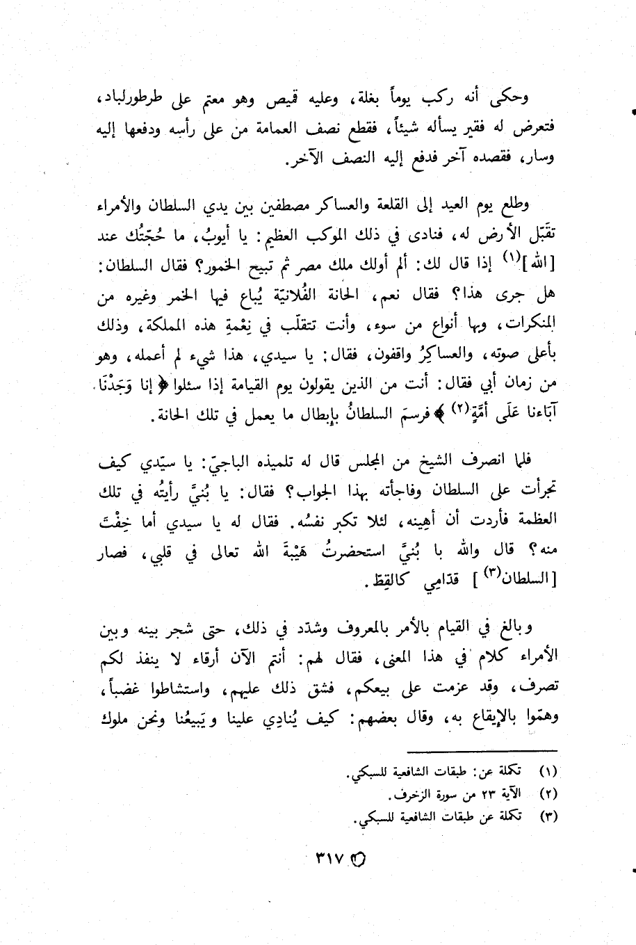 هل جرى هذا؟ فقال نعم، الحانة الفلانيّة يباع فيها الخمر وغيره من المنكرات، وبها أنواع من سوء، وأنت تتقلّب في نعمة هذه المملكة، وذلك بأعلى صوته، والعساكر واقفون، فقال: يا سيدي، هذا شيء لم أعمله، وهو من زمان أبي فقال: أنت من الذين يقولون يوم القيامة إذا سئلوا إِنَّا وَجَدْنا آباءَنا عَلى أُمَّةٍ (¬2) فرسم السلطان بإبطال ما يعمل في تلك الحانة.