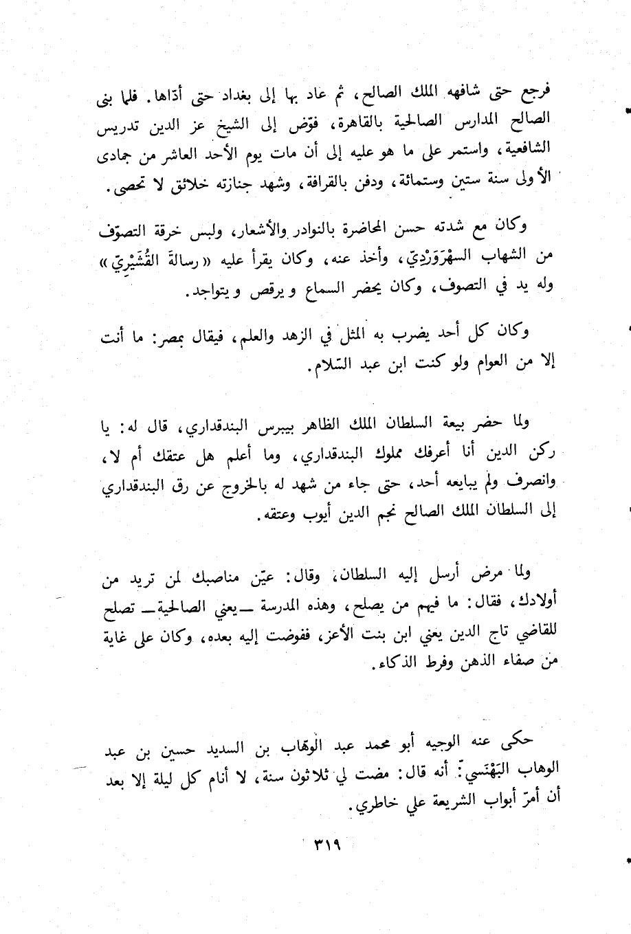 فرجع حتى شافهه الملك الصالح، ثم عاد بها إلى بغداد حتى أدّاها. فلما بنى الصالح المدارس الصالحية بالقاهرة، فوّض إلى الشيخ عز الدين تدريس الشافعية، واستمر على