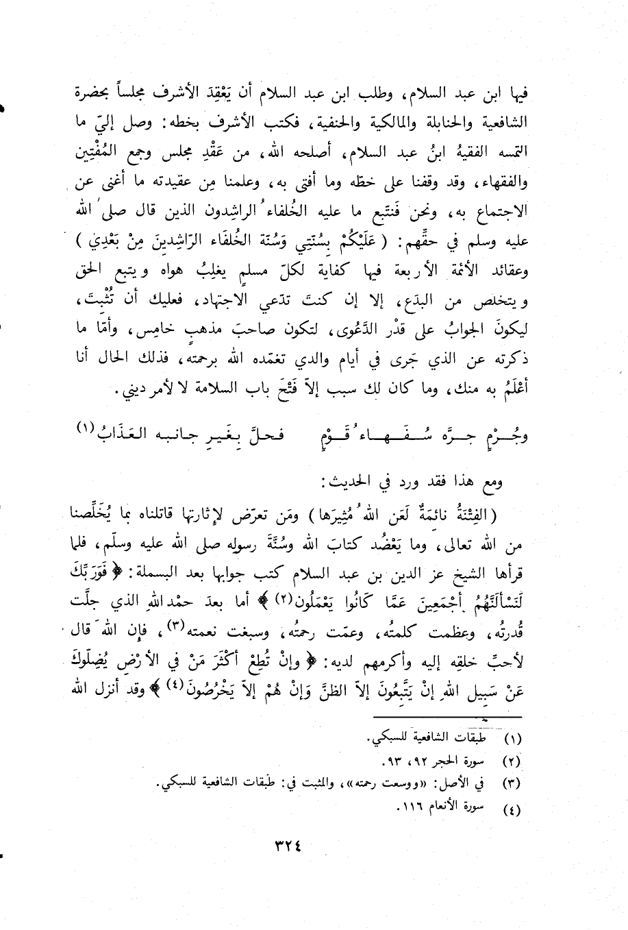 (الفتنة نائمة لعن الله مثيرها) ومن تعرّض لإثارتها قاتلناه بما يخلّصنا من الله تعالى، وما يعضد كتاب الله وسنّة رسوله صلى الله عليه وسلّم، فلما قرأها الشيخ عز الدين بن عبد السلام كتب جوابها بعد البسملة: فَوَ رَبِّكَ لَنَسْئَلَنَّهُمْ أَجْمَعِينَ عَمَّا كانُوا يَعْمَلُونَ (¬2) أما بعد حمد الله الذي جلّت قدرته، وعظمت كلمته، وعمّت رحمته، وسبغت نعمته (¬3)، فإن الله قال لأحبّ خلقه إليه وأكرمهم لديه: وَإِنْ تُطِعْ أَكْثَرَ مَنْ فِي الْأَرْضِ يُضِلُّوكَ عَنْ سَبِيلِ اللَّهِ إِنْ يَتَّبِعُونَ إِلَّا الظَّنَّ وَإِنْ هُمْ إِلَّا يَخْرُصُونَ (¬4) وقد أنزل الله