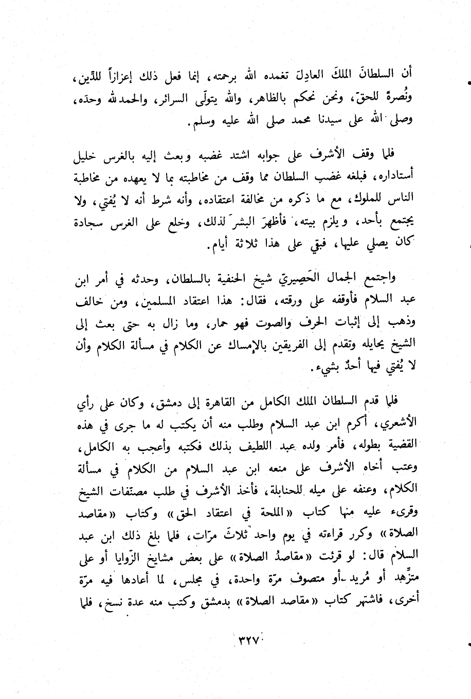 فلما قدم السلطان الملك الكامل من القاهرة إلى دمشق، وكان على رأي الأشعري، أكرم ابن عبد السلام وطلب منه أن يكتب له ما جرى في هذه القضية بطوله، فأمر ولده عبد اللطيف بذلك فكتبه وأعجب به الكامل، وعتب أخاه الأشرف على منعه ابن عبد السلام من الكلام في مسألة الكلام، وعنفه على ميله للحنابلة، فأخذ الأشرف في طلب مصنّفات الشيخ وقرئ عليه منها كتاب «الملحة في اعتقاد الحق» وكتاب «مقاصد الصلاة» وكرر قراءته في يوم واحد ثلاث مرّات، فلما بلغ ذلك ابن عبد السلام قال: لو