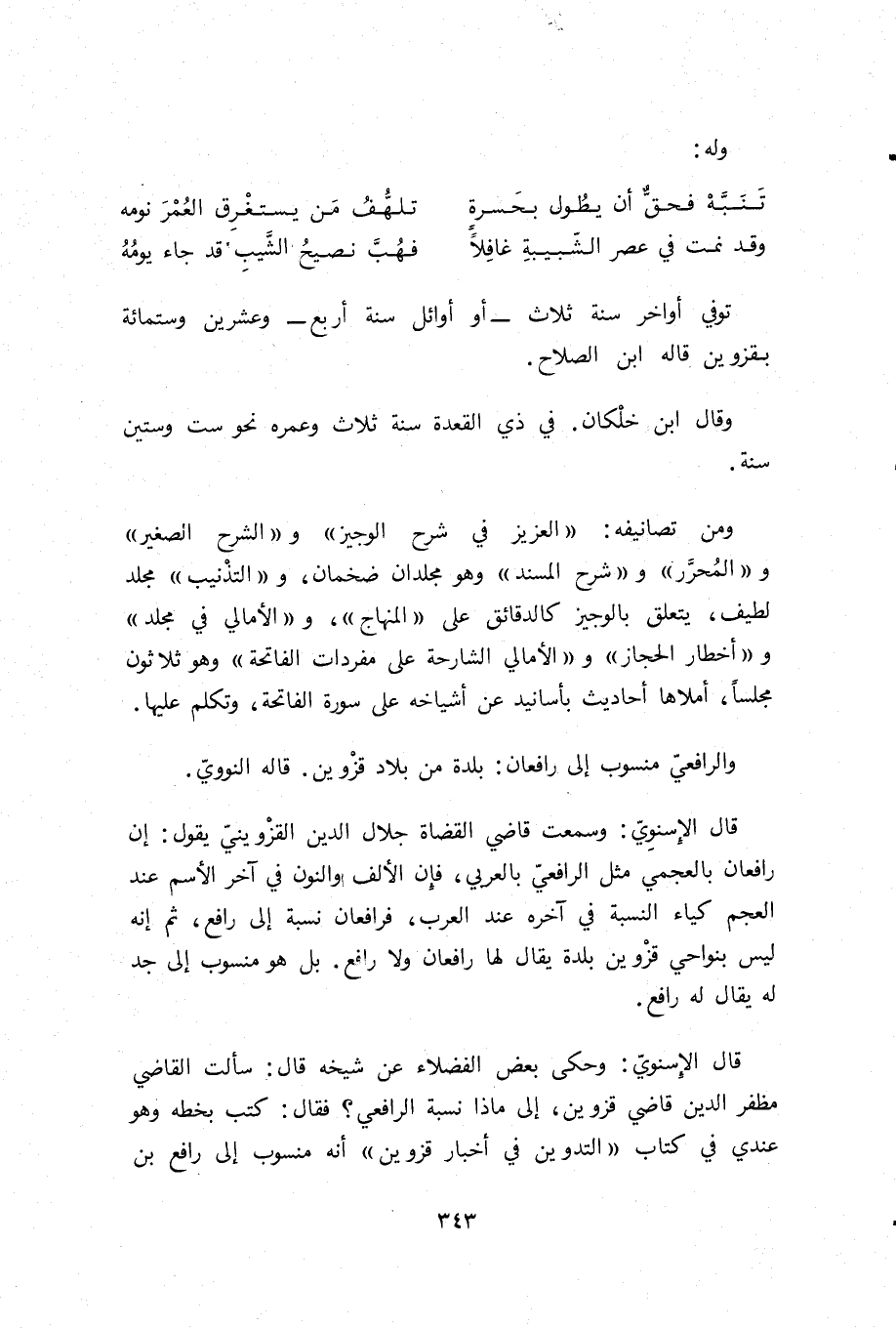 قال الإسنويّ: وحكى بعض الفضلاء عن شيخه قال: سألت القاضي مظفر الدين قاضي قزوين، إلى ماذا نسبة الرافعي؟ فقال: كتب بخطه وهو عندي في كتاب «التدوين في أخبار قزوين» أنه منسوب إلى رافع بن