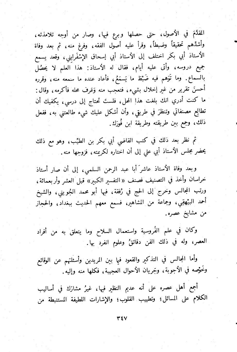 المقدّم في الأصول، حتى حصلها وبرع فيها، وصار من أوجه تلامذته، وأشدّهم تحقيقا وضبطا، وقرأ عليه أصول الفقه، وفرغ منه، ثم بعد وفاة الأستاذ أبي بكر اختلف إلى الأستاذ أبي إسحاق الإسفرايني، وقعد يسمع جميع دروسه، وأتى عليه أيام، فقال له الأستاذ: هذا العلم لا يحصل بالسماع. وما توهم فيه ضبط ما يسمع، فأعاد عنده ما سمعه منه، وقرره أحسن تقرير من غير إخلال بشيء، فتعجب منه وعرف محله فأكرمه، وقال: