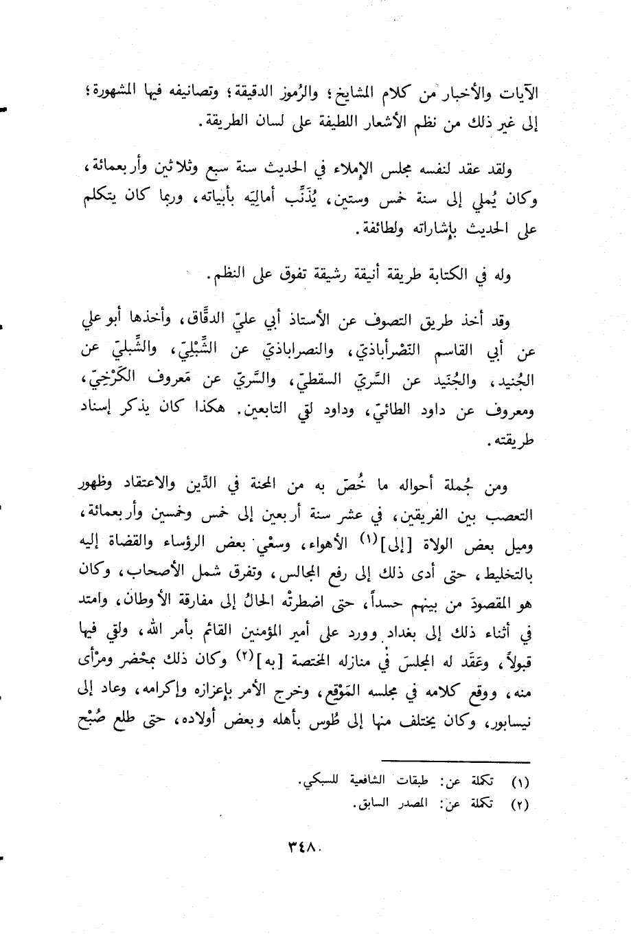 ومن جملة أحواله ما خصّ به من المحنة في الدّين والاعتقاد وظهور التعصب بين الفريقين، في عشر سنة أربعين إلى خمس وخمسين وأربعمائة، وميل بعض الولاة [إلى] (¬1) الأهواء، وسعي بعض الرؤساء والقضاة إليه بالتخليط، حتى أدى ذلك إلى رفع المجالس، وتفرق شمل الأصحاب، وكان هو المقصود من بينهم حسدا، حتى اضطرته الحال إلى مفارقة الأوطان، وامتد في أثناء ذلك إلى بغداد وورد على أمير المؤمنين القائم بأمر الله، ولقي فيها قبولا، وعقد له المجلس في منازله المختصة [به] (¬2) وكان ذلك بمحضر ومرأى منه، ووقع كلامه في مجلسه الموقع، وخرج الأمر بإعزازه وإكرامه، وعاد إلى نيسابور، وكان يختلف منها إلى طوس بأهله وبعض أولاده، حتى طلع صبح