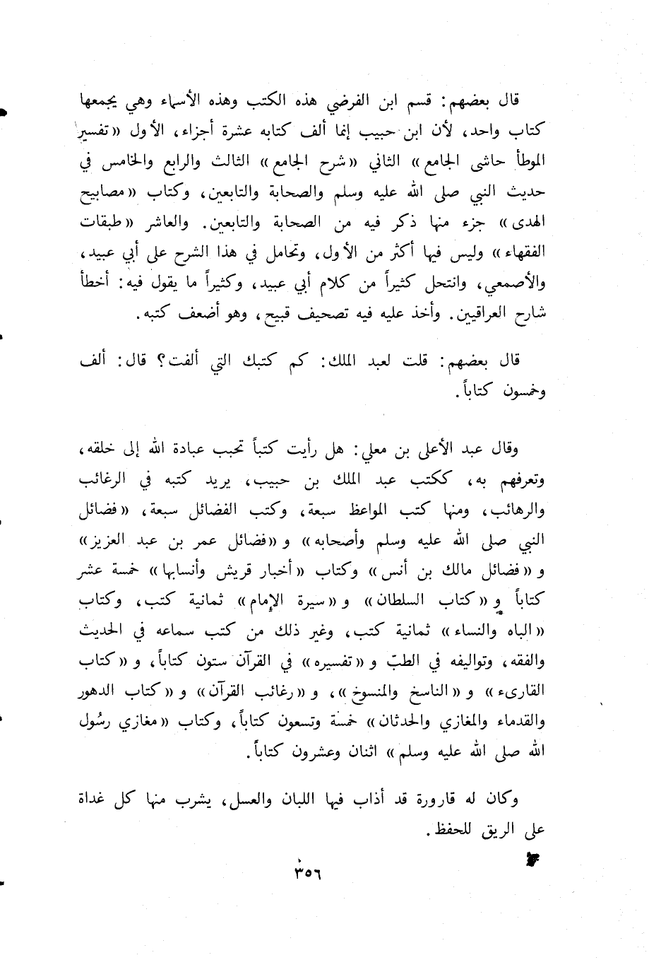 وقال عبد الأعلى بن معلي: هل رأيت كتبا تحبب عبادة الله إلى خلقه، وتعرفهم به، ككتب عبد الملك بن حبيب، يريد كتبه في الرغائب والرهائب، ومنها كتب المواعظ سبعة، وكتب الفضائل سبعة، «فضائل النبي صلى الله عليه وسلم وأصحابه» و «فضائل عمر بن عبد العزيز» و «فضائل مالك بن أنس» وكتاب «أخبار قريش وأنسابها» خمسة عشر كتابا و «كتاب السلطان» و «سيرة الإمام» ثمانية كتب، وكتاب «الباه والنساء» ثمانية كتب، وغير ذلك من كتب سماعه في الحديث والفقه، وتواليفه في الطبّ و «تفسيره» في القرآن ستون كتابا، و «كتاب القارئ» و «الناسخ والمنسوخ»، و «رغائب القرآن» و «كتاب الدهور والقدماء والمغازي والحدثان» خمسة وتسعون كتابا، وكتاب «مغازي رسول الله صلى الله عليه وسلم» اثنان وعشرون كتابا.