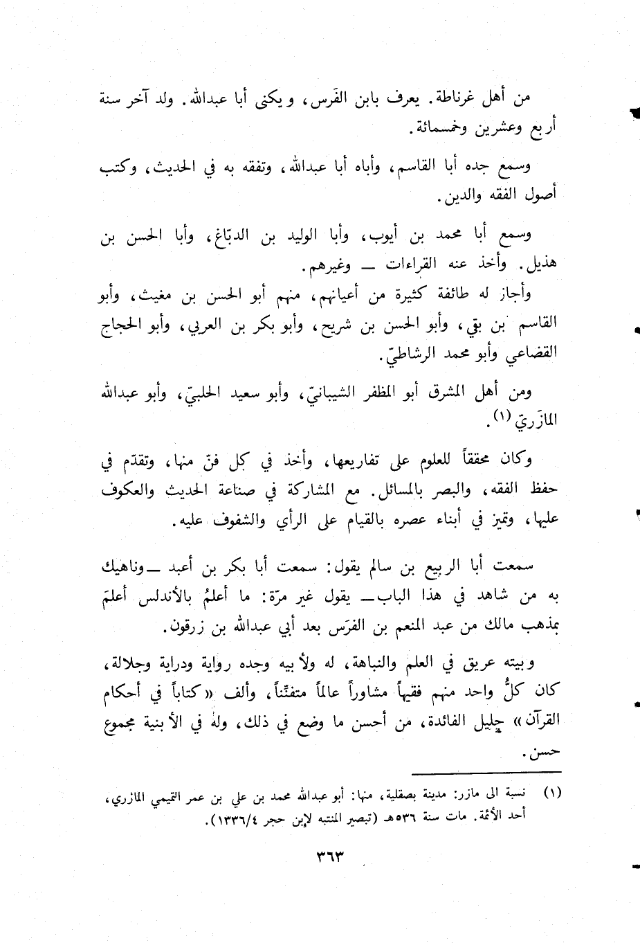 (¬1) نسبة الى مازر: مدينة بصقلية، منها: أبو عبد الله محمد بن علي بن عمر التميمي المازري، أحد الأئمة، مات سنة 536 هـ (تبصير المنتبه لابن حجر 4/ 1336).