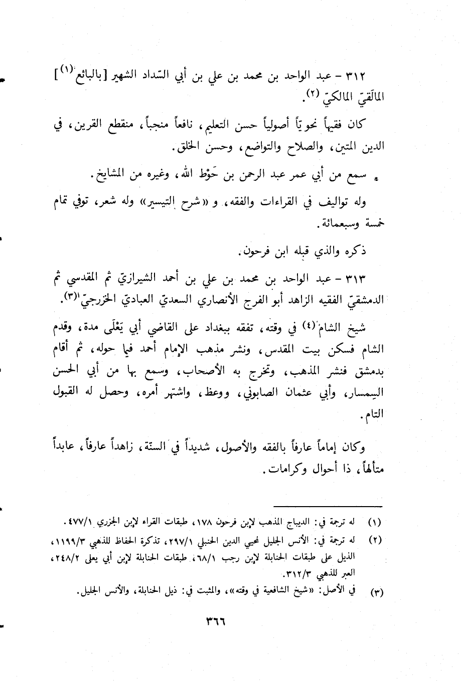 313 - عبد الواحد بن محمد بن علي بن أحمد الشيرازيّ ثم المقدسي ثم الدمشقيّ الفقيه الزاهد أبو الفرج الأنصاري السعديّ العباديّ الخزرجيّ (¬3).