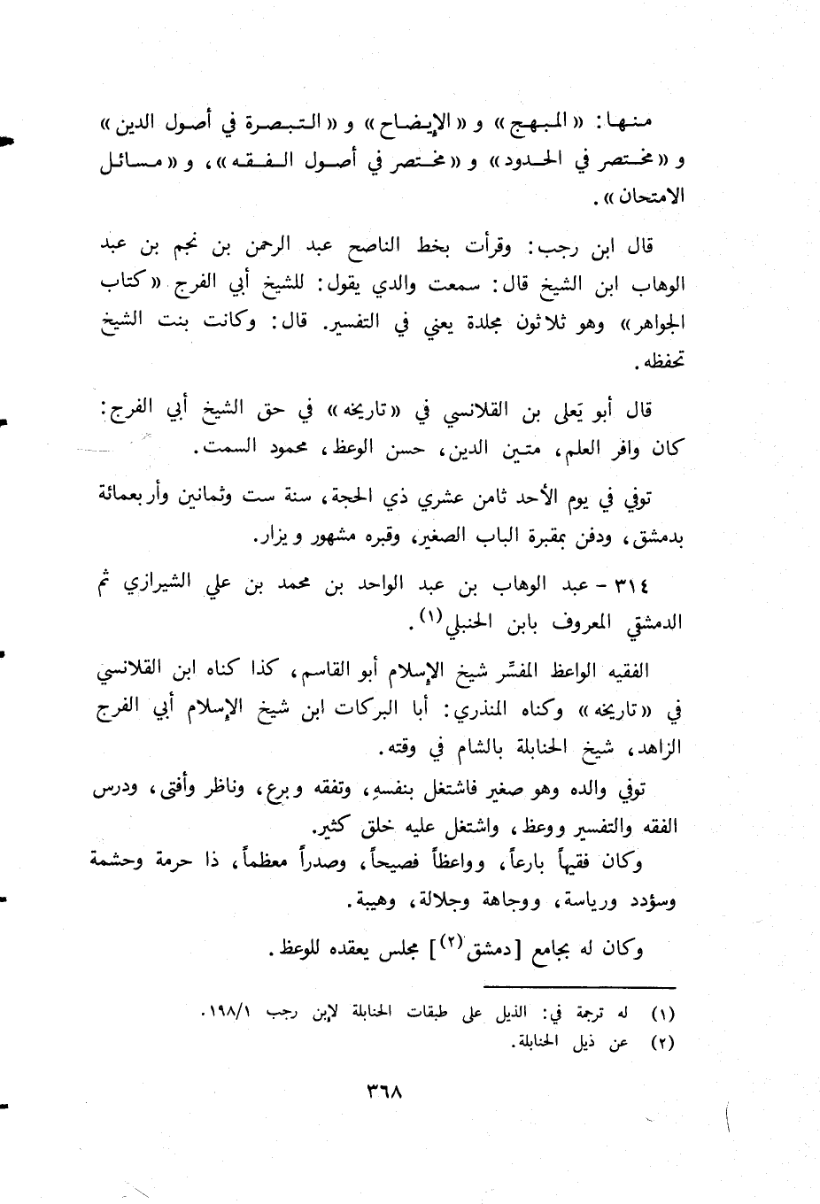 314 - عبد الوهاب بن عبد الواحد بن محمد بن علي الشيرازي ثم الدمشقي المعروف بابن الحنبلي (¬1).