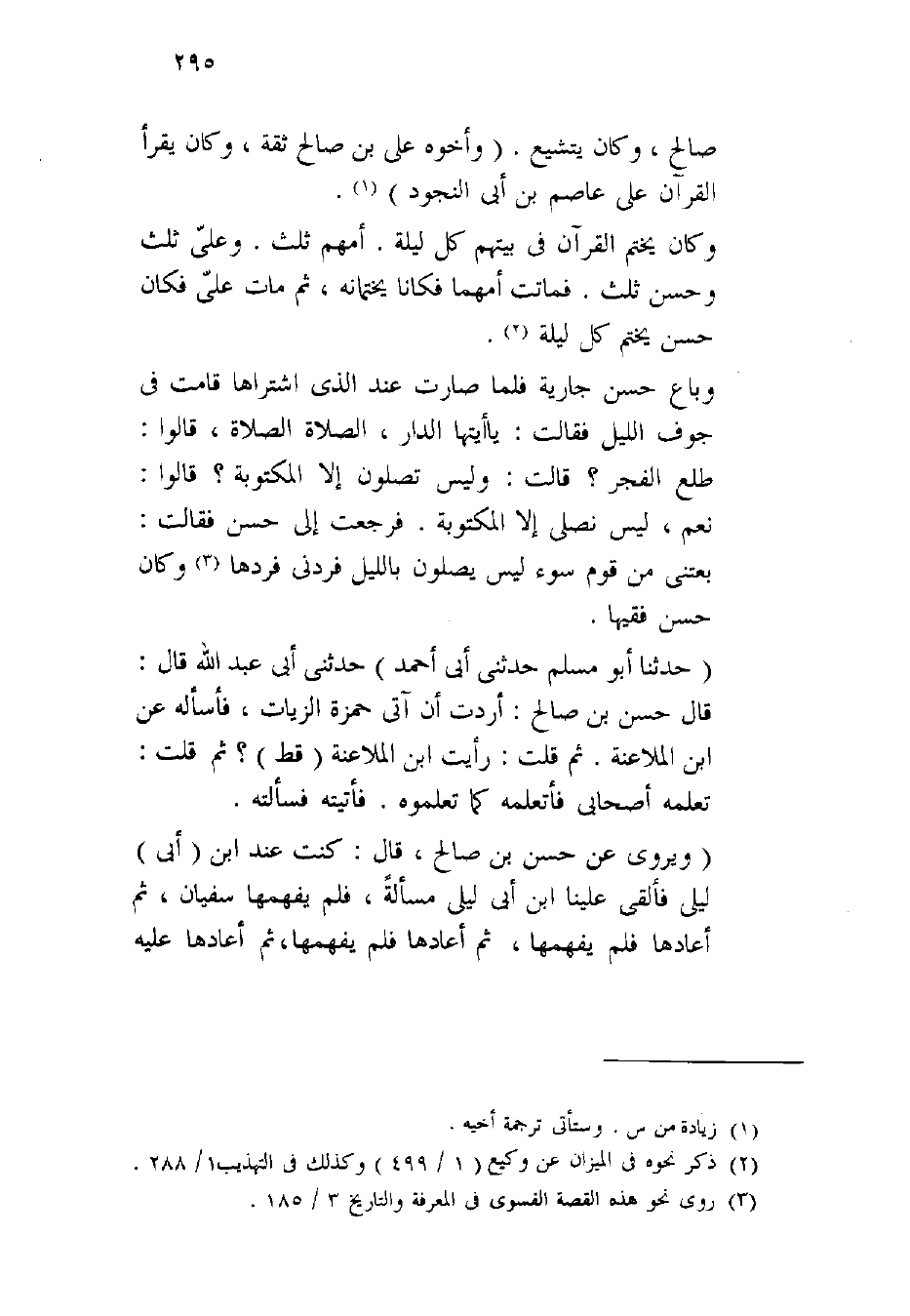 صَالح وَكَانَ يتشيع وَأَخُوهُ على بن صَالح ثِقَة وَكَانَ يقْرَأ الْقُرْآن على عَاصِم بن أبي النجُود وَكَانَ يخْتم الْقُرْآن فِي بَيتهمْ كل لَيْلَة أمّهم ثلث وعَلى ثلث وَحسن ثلث فَمَاتَتْ أمهما فَكَانَا يختمانه ثمَّ مَاتَ على فَكَانَ حسن يخْتم كل لَيْلَة وَبَاعَ حسن جَارِيَة فَلَمَّا صَارَت عِنْد الَّذِي اشْتَرَاهَا قَامَت فِي جَوف اللَّيْل فَقَالَت يَا أيتها الدَّار الصَّلَاة الصَّلَاة قَالُوا طلع الْفجْر قَالَت وَلَيْسَ تصلونَ إِلَّا الْمَكْتُوبَة قَالُوا نعم لَيْسَ نصلى إِلَّا الْمَكْتُوبَة فَرَجَعت إِلَى حسن فَقَالَت بعتنى من قوم سوء لَيْسَ يصلونَ بِاللَّيْلِ فردنى فَردهَا وَكَانَ حسن فَقِيها حَدثنَا أَبُو مُسلم حَدثنِي أبي أَحْمد حَدثنِي أبي عبد الله قَالَ قَالَ حسن بن صَالح أردْت أَن آتى حَمْزَة الزيات فأسأله عَن بن الْمُلَاعنَة ثمَّ قلت رَأَيْت بن الْمُلَاعنَة قطّ ثمَّ قلت تعلمه أَصْحَابِي فأتعلمه كَمَا تعلموه فَأَتَيْته فَسَأَلته ويروى عَن حسن بن صَالح قَالَ كنت عِنْد بن أبي ليلى فَألْقى علينا بن أبي ليلى مَسْأَلَة فَلم يفهمها سُفْيَان ثمَّ أَعَادَهَا فَلم يفهمها ثمَّ أَعَادَهَا فَلم يفهمها ثمَّ أَعَادَهَا عَلَيْهِ ففهمها فَجعل سُفْيَان يحمد الله فَعلمت أَنه يُرِيد وَجه الله