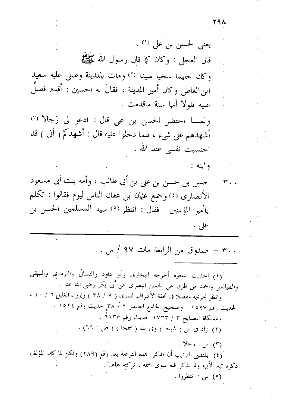 300 - حسن بن حسن بن على بن أبي طَالب وَأمه بنت أبي مَسْعُود الْأنْصَارِيّ وَجمع عُثْمَان بن عَفَّان النَّاس ليَوْم فَقَالُوا تكلم يَا أَمِير الْمُؤمنِينَ فَقَالَ انْتظر سيد الْمُسلمين الْحسن بن على