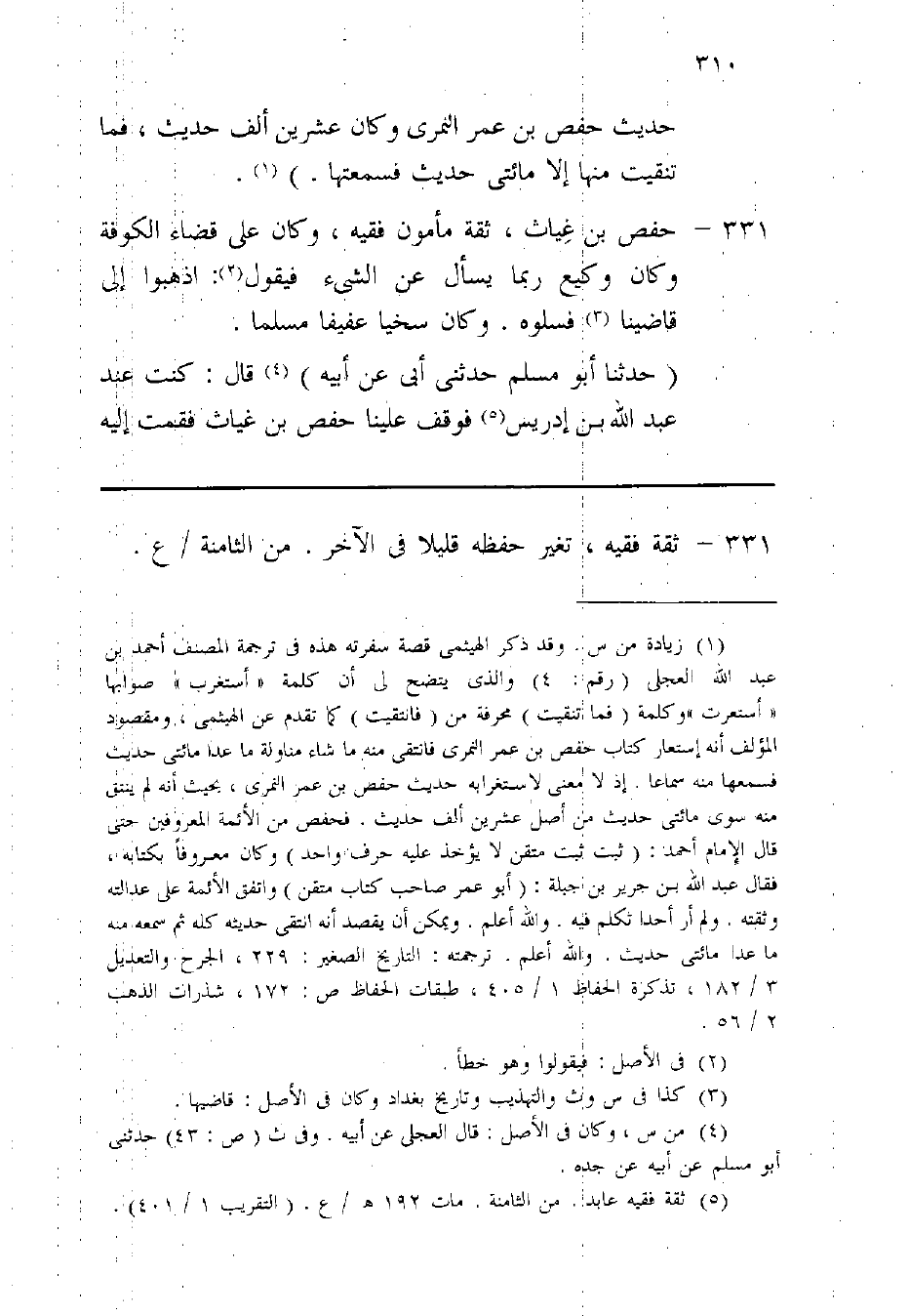 331 - حَفْص بن غياث ثِقَة مَأْمُون فَقِيه وَكَانَ على قَضَاء الْكُوفَة وَكَانَ وَكِيع رُبمَا يسْأَل عَن الشَّيْء فَيَقُول اذْهَبُوا إِلَى قاضينا فسلوه وَكَانَ سخيا عفيفا مُسلما حَدثنَا أَبُو مُسلم حَدثنِي أبي عَن أَبِيه قَالَ كنت عِنْد عبد الله بن إِدْرِيس فَوقف علينا حَفْص بن غياث فَقُمْت إِلَيْهِ فَسلمت عَلَيْهِ فَقَالَ بن إِدْرِيس لم قُمْت إِلَيْهِ قلت يَا أَبَا مُحَمَّد قاضينا وَشَيخ من شُيُوخنَا فَقَالَ لي مَا أعجبنى مَا صنعت