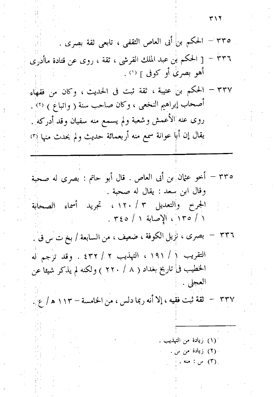 337 - الحكم بن عتيبة ثِقَة ثَبت فِي الحَدِيث وَكَانَ من فُقَهَاء أَصْحَاب إِبْرَاهِيم النَّخعِيّ وَكَانَ صَاحب سنة وَأَتْبَاع روى عَنهُ الْأَعْمَش وَشعْبَة وَلم يسمع مِنْهُ سُفْيَان وَقد أدْركهُ يُقَال إِن أَبَا عوَانَة سمع مِنْهُ أَرْبَعمِائَة حَدِيث وَلم يحدث مِنْهَا إِلَّا بحديثين وَترك الْبَاقِي فرقا من شُعْبَة وَكَانَ فِيهِ تشيع إِلَّا أَن ذَلِك لم يظْهر مِنْهُ إِلَّا بعد مَوته